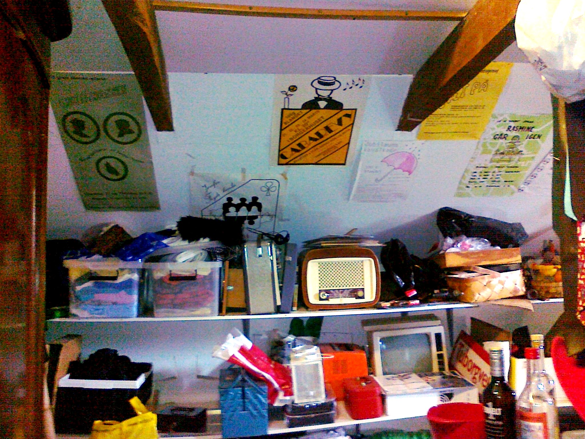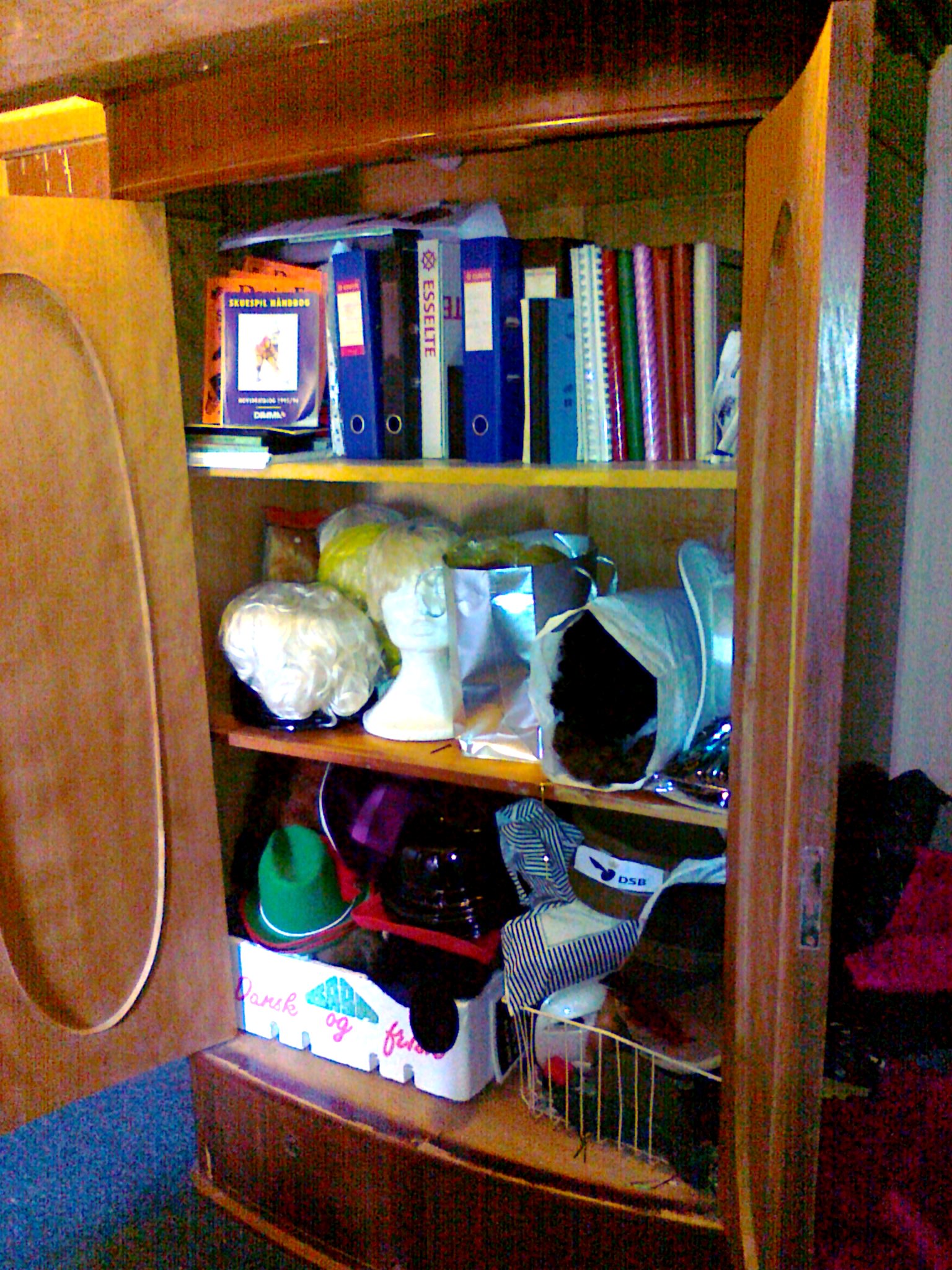 Hvad skabet på loftet gemmer Skabet på loftet i Borgerhuset har i mange år været arkivskab for de mange aktiviteter der har foregået i foreningen. Det drejer sig om tekstbøger til diletantforestillinger, regnskaber, referater fra generalforsamlinger, bestyrelsesmøder, plakater, fotos og som det ses også magasin for parykker m.m. | |