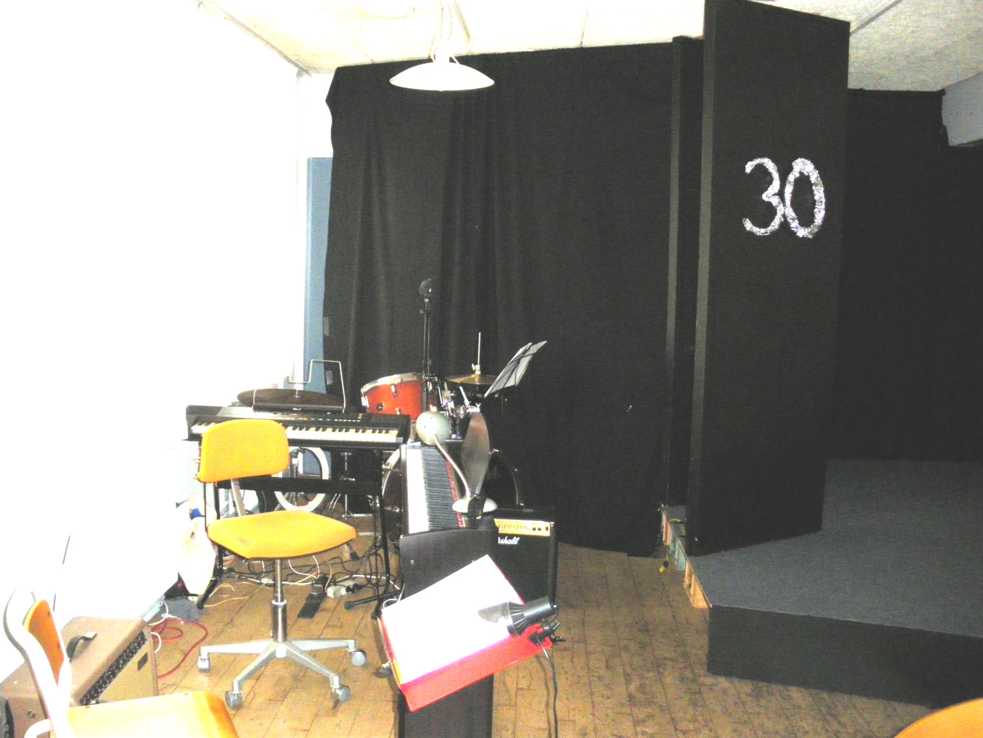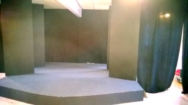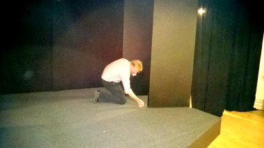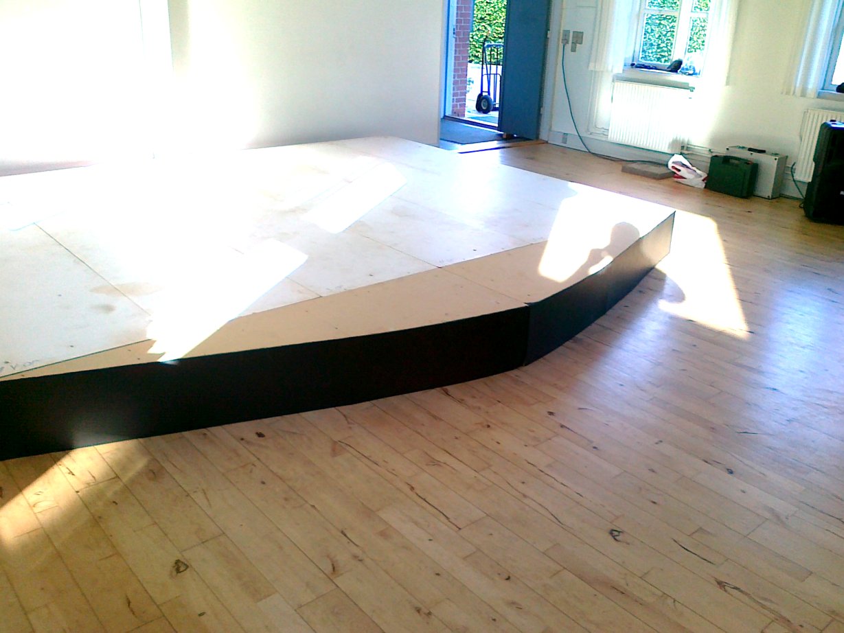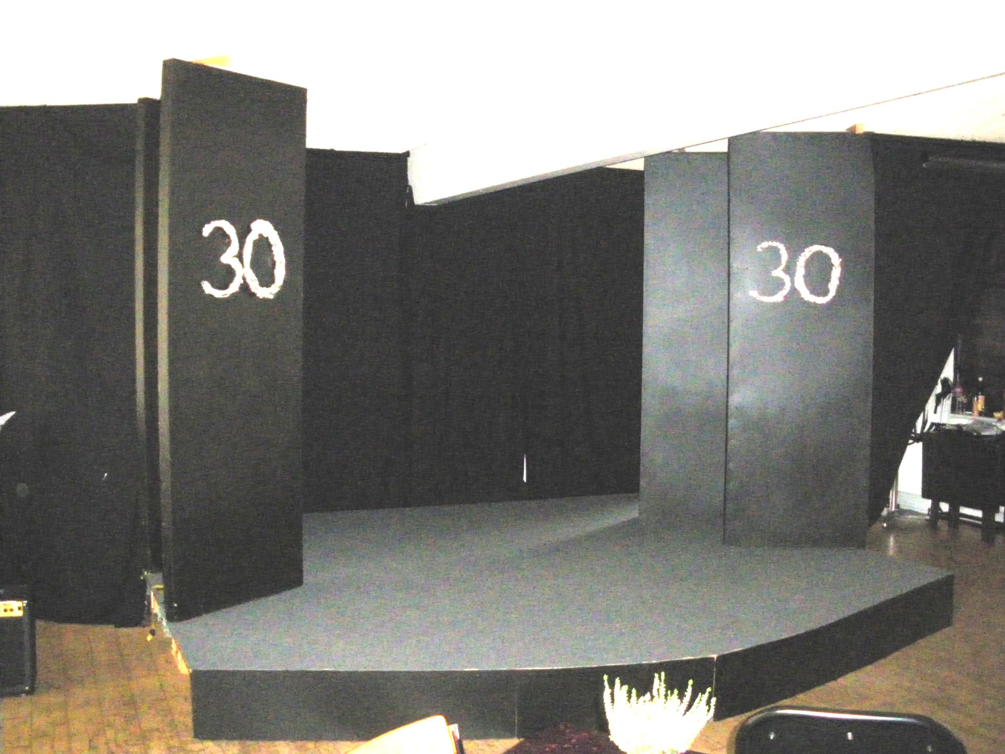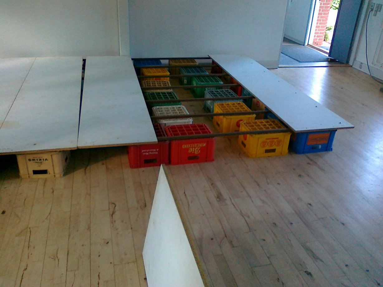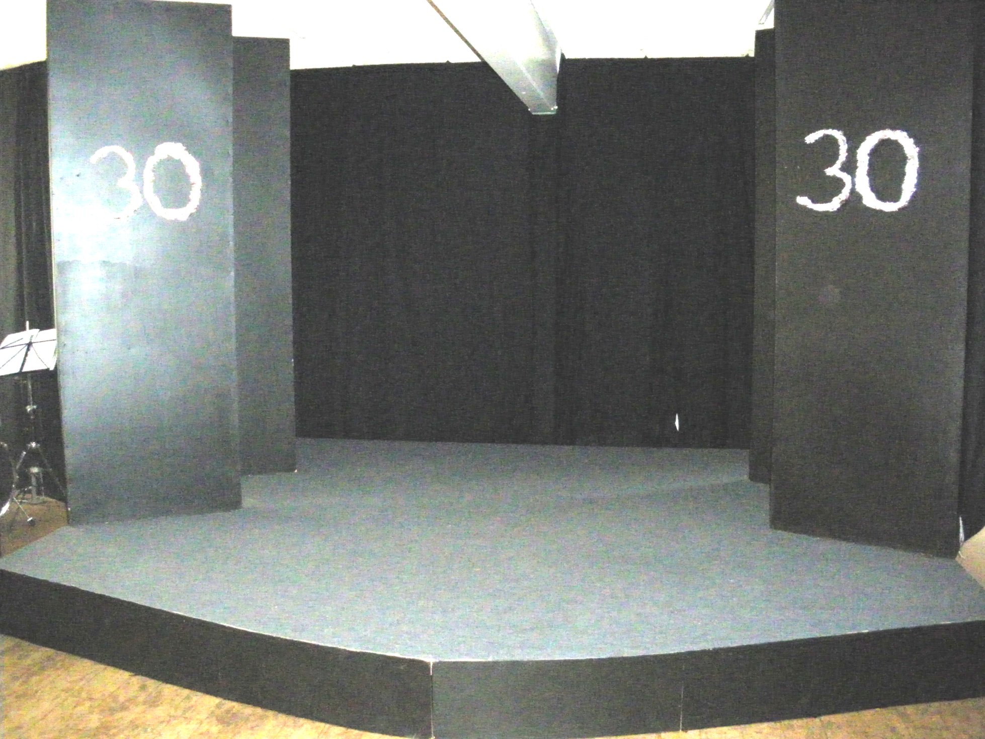 | Sceneopbygningen har i en årrække været en konstruktion, hvor fundamentet er sodavandskasser der i en passende afstand understøtter scenegulvet. Med 21 billeder vises forløbet med transport fra Borgerhusets loft og selve opbygningen. Det er en tidsmæssig overskuelig opgave, da man inden for et par timer har det hele klar. Da man tidligere spillede revy på skolen, skulle scenemateriellet transporteres fra loftet og til skolen på trailer m.m. og det var meget mere omfattende.