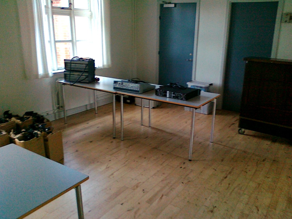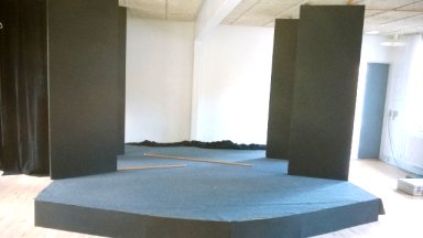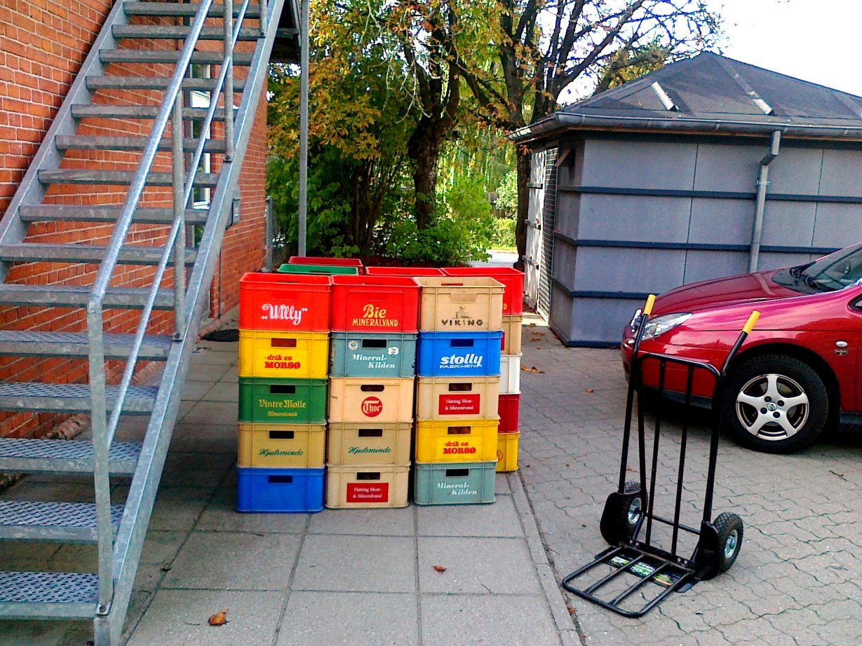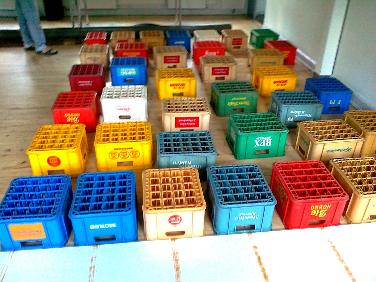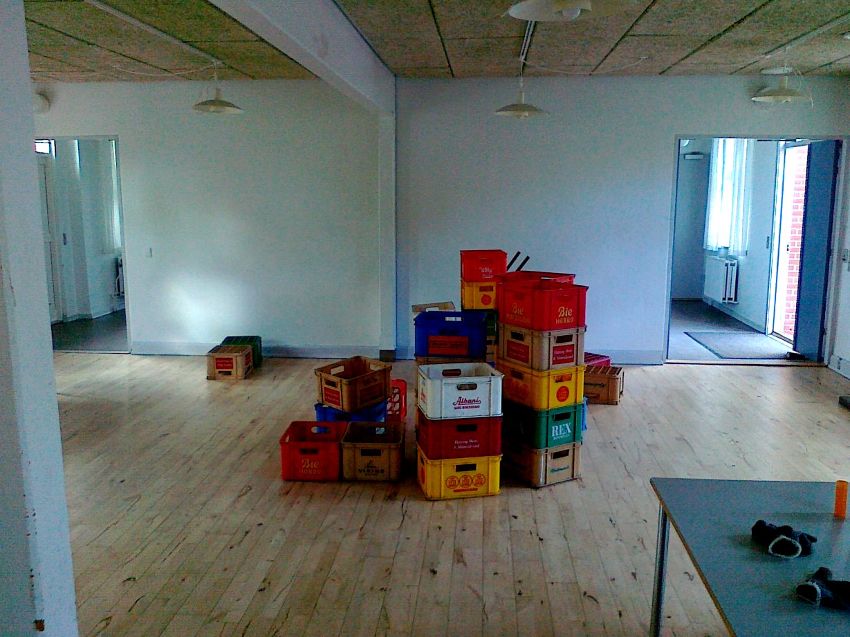 | Sceneopbygningen har i en årrække været en konstruktion, hvor fundamentet er sodavandskasser der i en passende afstand understøtter scenegulvet. Med 21 billeder vises forløbet med transport fra Borgerhusets loft og selve opbygningen. Det er en tidsmæssig overskuelig opgave, da man inden for et par timer har det hele klar. Da man tidligere spillede revy på skolen, skulle scenemateriellet transporteres fra loftet og til skolen på trailer m.m. og det var meget mere omfattende.