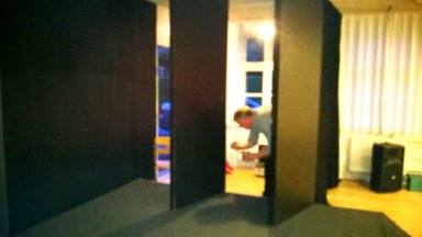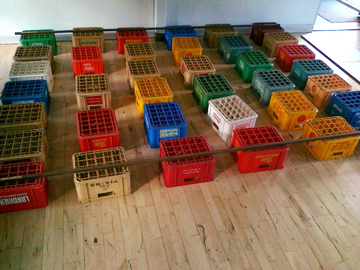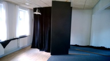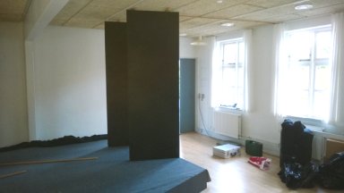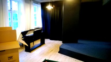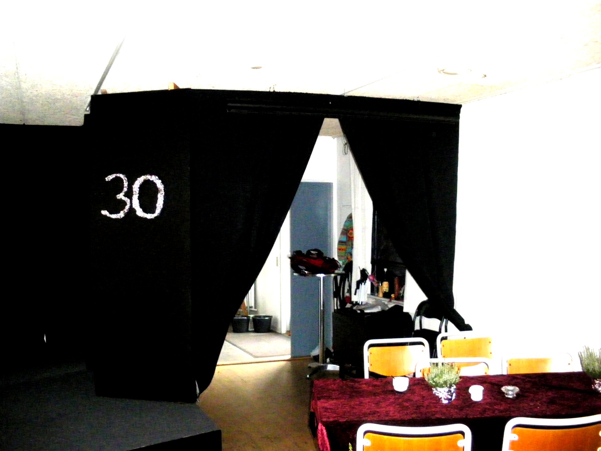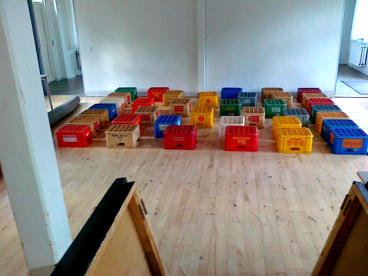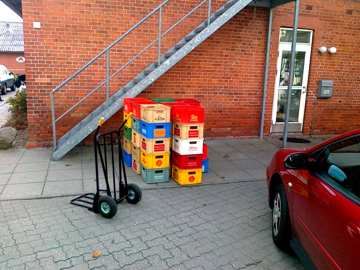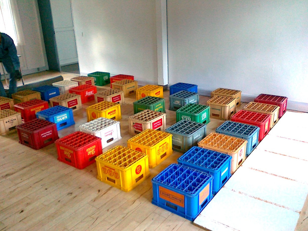 | Sceneopbygningen har i en årrække været en konstruktion, hvor fundamentet er sodavandskasser der i en passende afstand understøtter scenegulvet. Med 21 billeder vises forløbet med transport fra Borgerhusets loft og selve opbygningen. Det er en tidsmæssig overskuelig opgave, da man inden for et par timer har det hele klar. Da man tidligere spillede revy på skolen, skulle scenemateriellet transporteres fra loftet og til skolen på trailer m.m. og det var meget mere omfattende.
