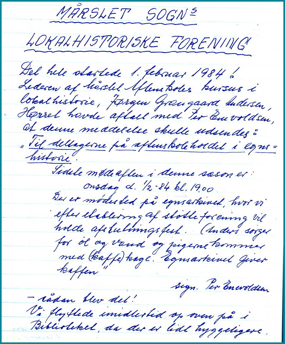 Fra Mårslet Sogns Lokalhistoriske Forenings protokol. 1984.