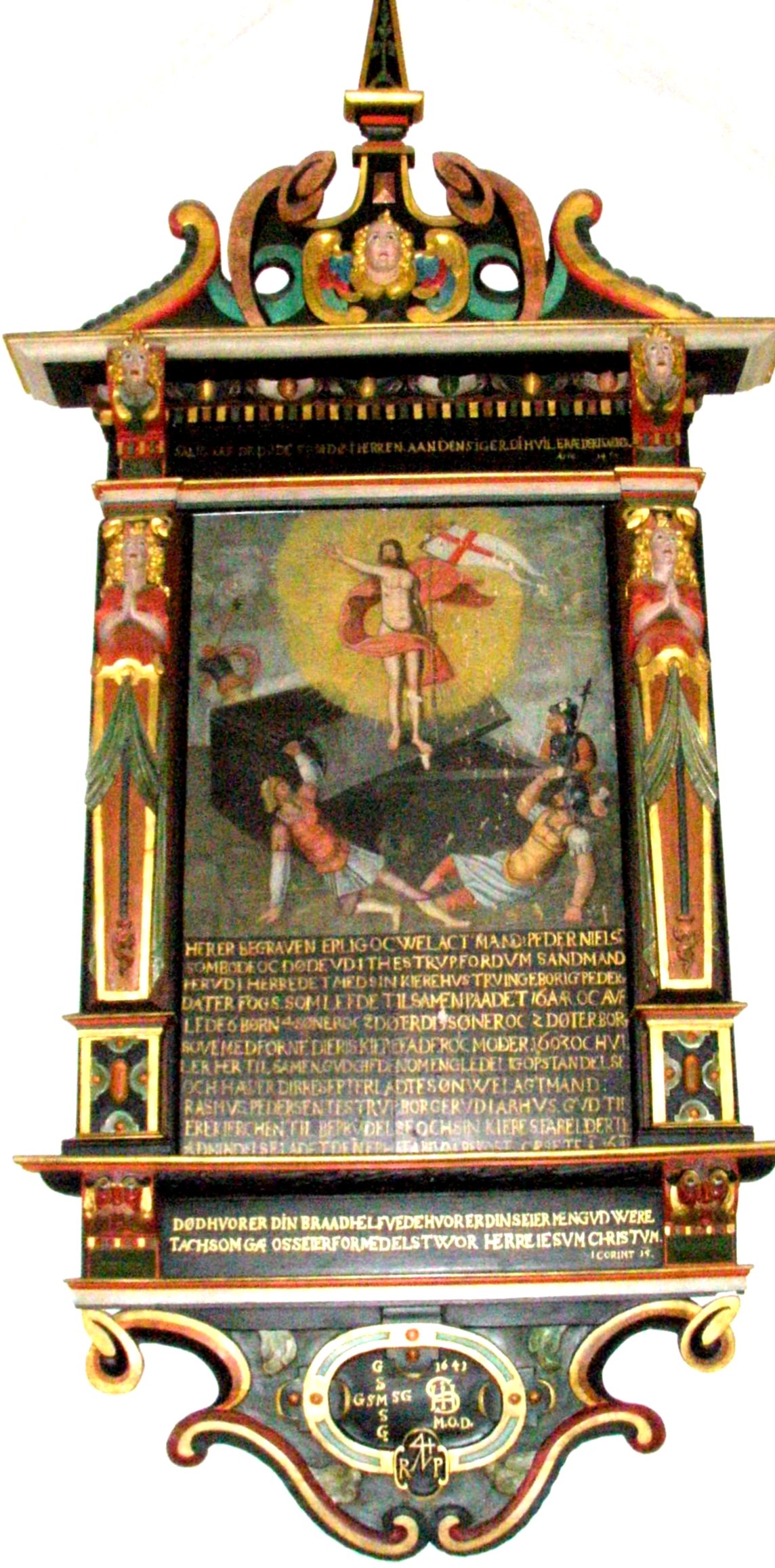 Billedet er givet til Egnsarkivet af Jenny Dybvad - Det er hendes fødegård. Epitafiet på nordvæggen i Mårslet Kirke, oprindeligt opsat i 1641 af Rasmus Pedersen Thestrup, har (igen) været plastret til med mange små lapper af japanpapir, der skulle forsegle og beskytte mod en begyndende afskalning af maleriet.