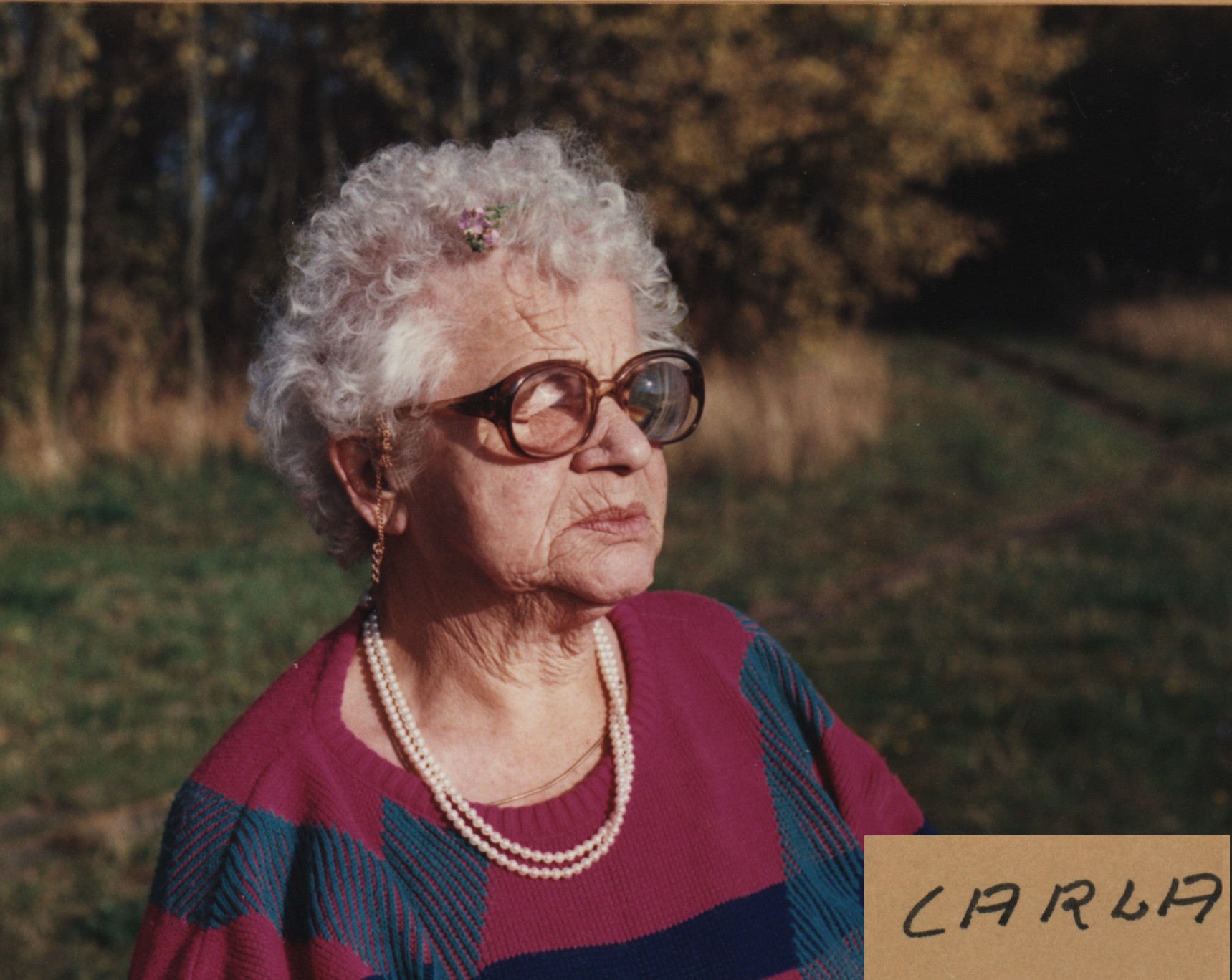 Carla Jensen fotograferet på Lokalcenter Kildvang. Carla Jensen døde den 3. august 1993 kort tid efter denne samtale. Hendes mand, Jens Peter Jensen, døde i 1973. Begge er begravet på Mårslet Kirkegård.