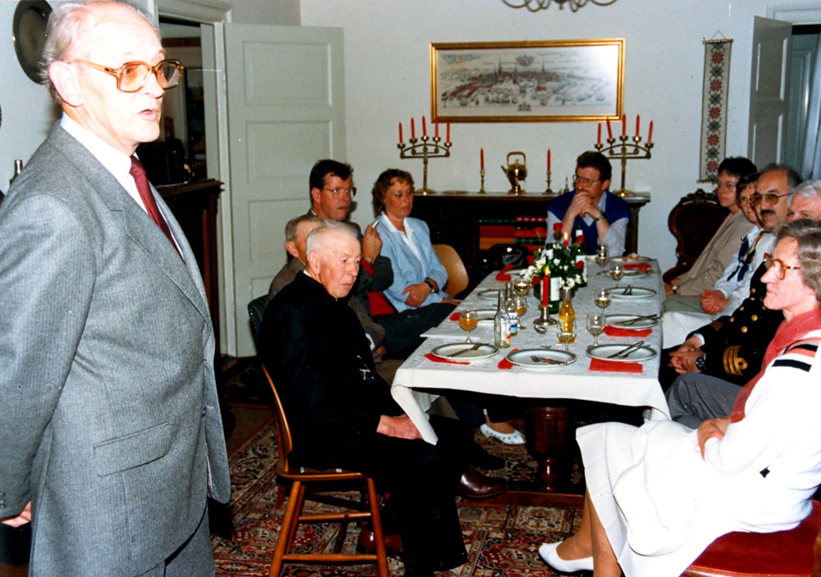 Fra receptionen i præstegården efter at skibet er modtaget i kirken ved festgudstjenesten pinsedag. Lokalhistoriker Hans Møller holder tale. Omkring bordet med uret: Kristian og Holger Hansen, som skænkede skibet. Skibsbyggeren Orla Fischer Laursen med frue, Horsens. Mogens og Inge Pedersen, Nina Møller, sognepræst Martin Kontni, orlogskaptajn Sven Voxtorp og fru provst Aagaard. Billede påMårslet Egnsarkiv Billed ID: B245 Registreret i Arkibas. Billede 2. Billede 3. Billede 4. Billede 5. Billede 6. Billede 7. Billede 8. Billede 9. Billede 10. Billede 11. Billede 12. Billede 13. Billede 14. Billede 15. Billede 16. Billede 17. Billede 18. Billede 19. Billede 20. Billede 21. Billede 22. Læs om FREDERICUS Quartus | ||