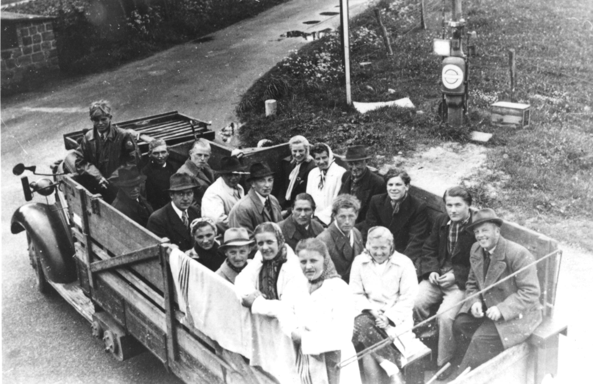 Badmintonspillere fra Mårslet på vej til Virring fotograferet udenfor Viggo Riis, Testrup ca. 1945-46.