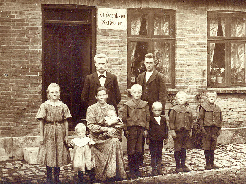 | Fra venstre: Karen Hedegaard, Anna, mor Ane Katrine f. Pedersen fra Beder, far Kresten Frederiksen fra Ravnholt, barn v. moderen, Karl, Jens, Thorvald, Christian og Anton. På billedet mangler ufødte børn Otto, Ove, Ellen og Else. Original billede på Mårslet Egnsarkiv. Arkivskab 4 - Skuffe 1. | |||