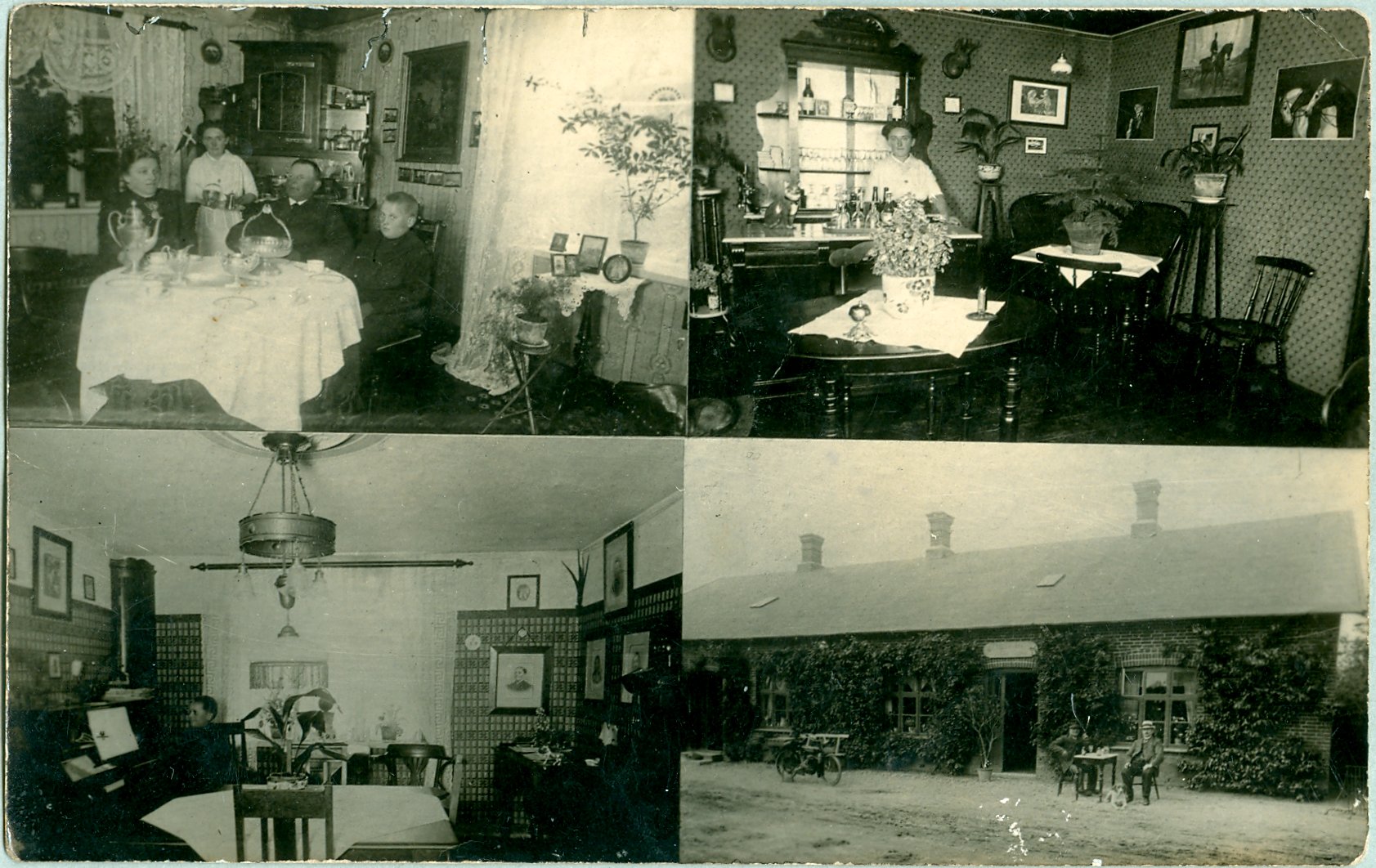 | Faster Dagmar i restaurationen. Nederst til højre: En udendørs 'formiddagskaffe' med afholdsvært Peder Kristiansen og tømmermester Peter Jelsbak- hvis motorcykel er parkeret. Se billede større - tryk på billedet. Original billede på Mårslet Egnsarkiv. Billed ID: B61 Registreret i Arkibas. Genkendt og kommenteret af: Peder Kristiansen. Tåstrup. Juni 2009. Født på Afholdshotellet 1936. | |