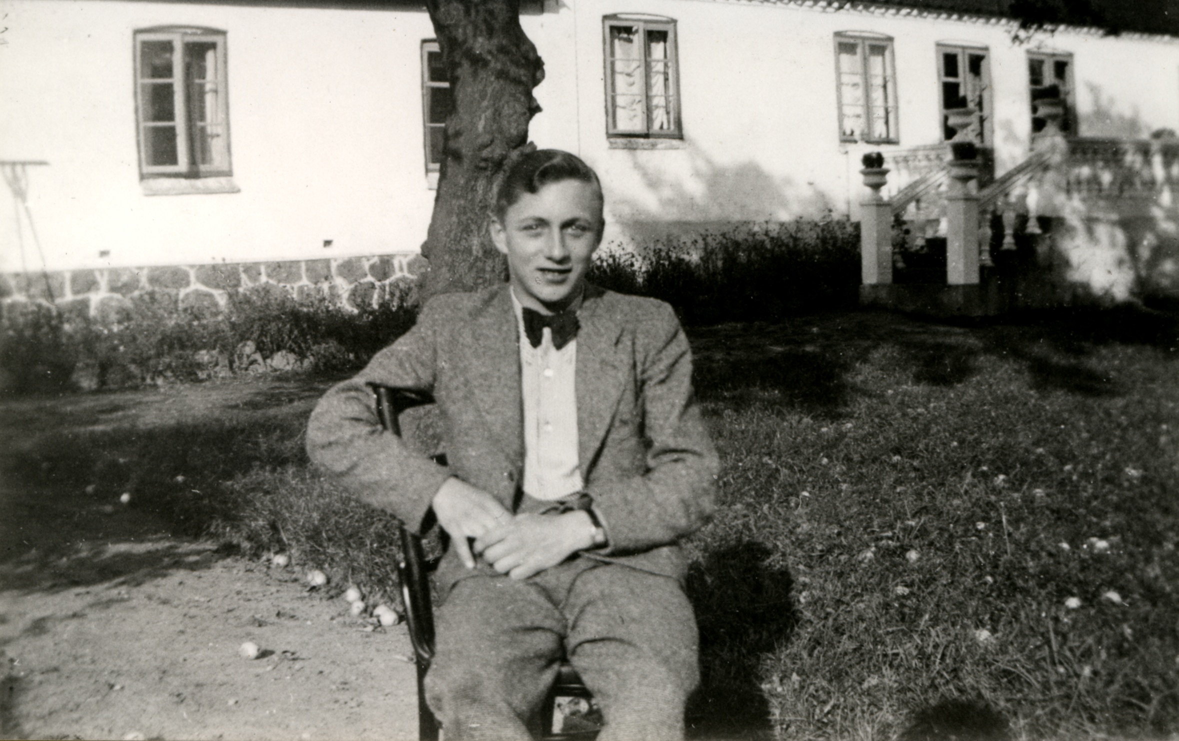 Lars Dybvad (Larsen) (1921-2001) i sit nye pinsesnit udenfor Bomgården i 1939.