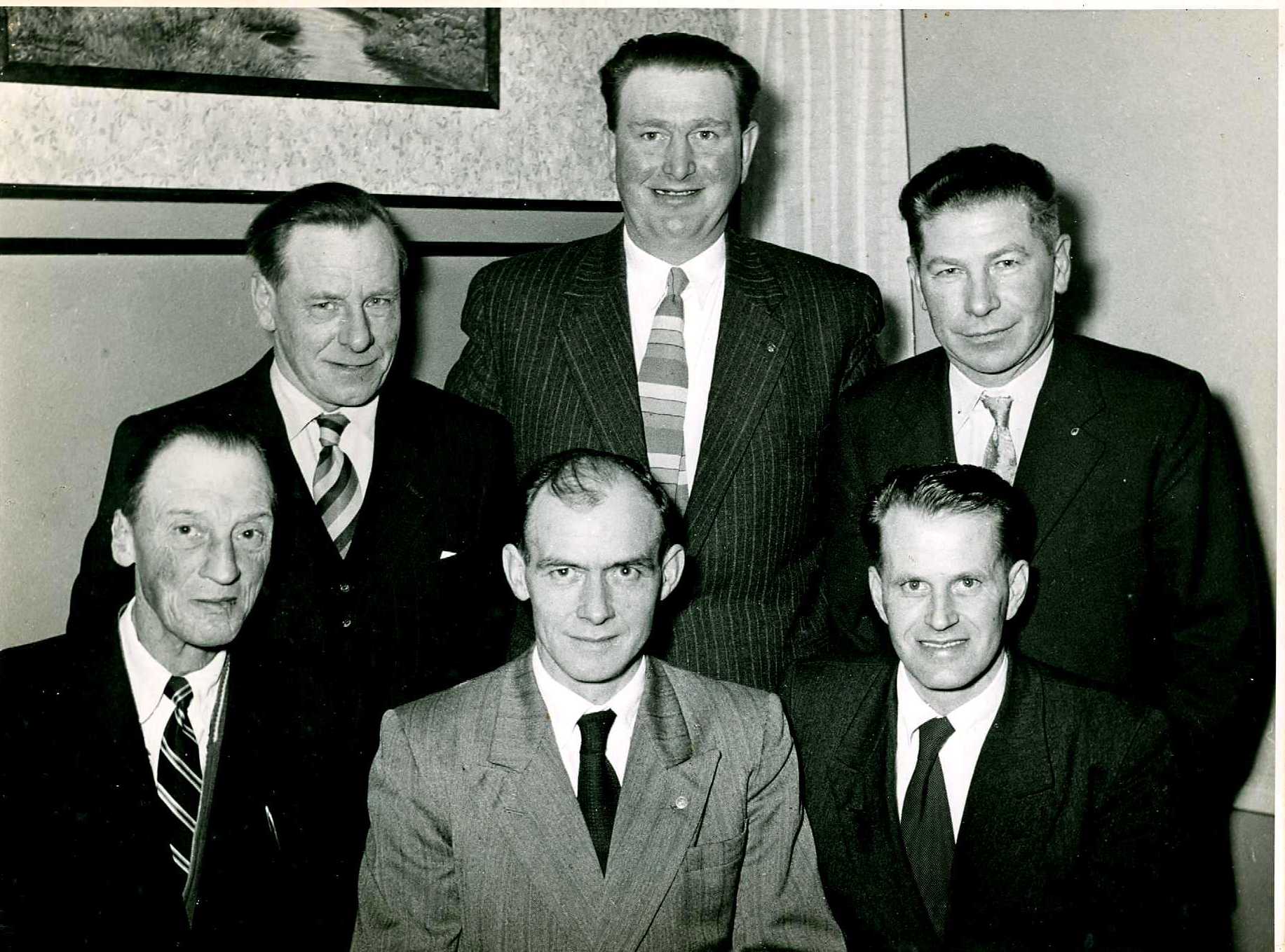 Medlemmer af Dansk Arbejdsmands Forbund, Mårslet afdeling. Kaldet "Fagforeningen" her ses bestyrelsen år ca. 1955