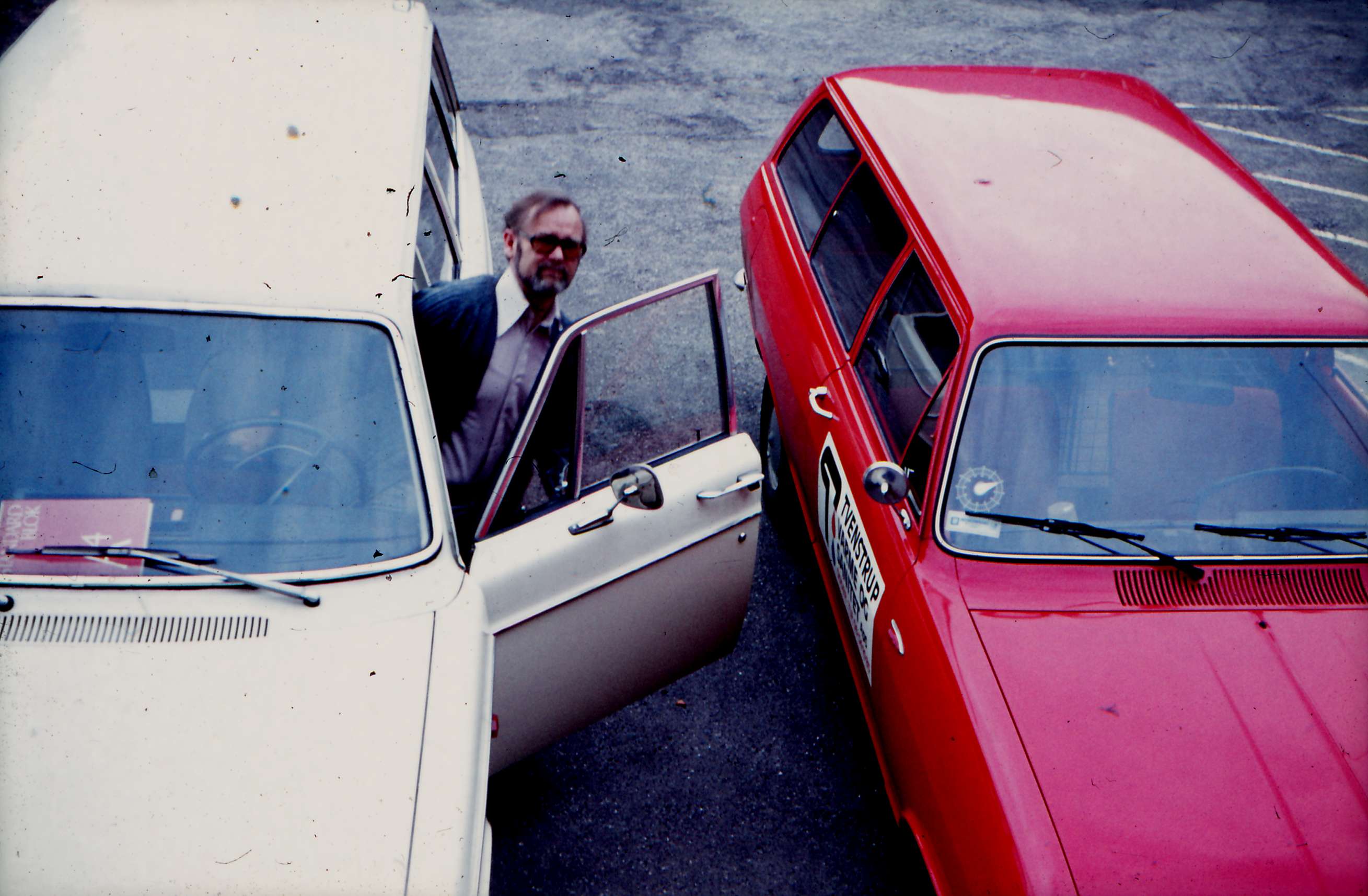 | Skoleinspektør Jørgen Brandt Lassen ankommer. Billed ID: B5289. Dias opbevares på Mårslet Egnsarkiv Registreret i Arkibas. | |||