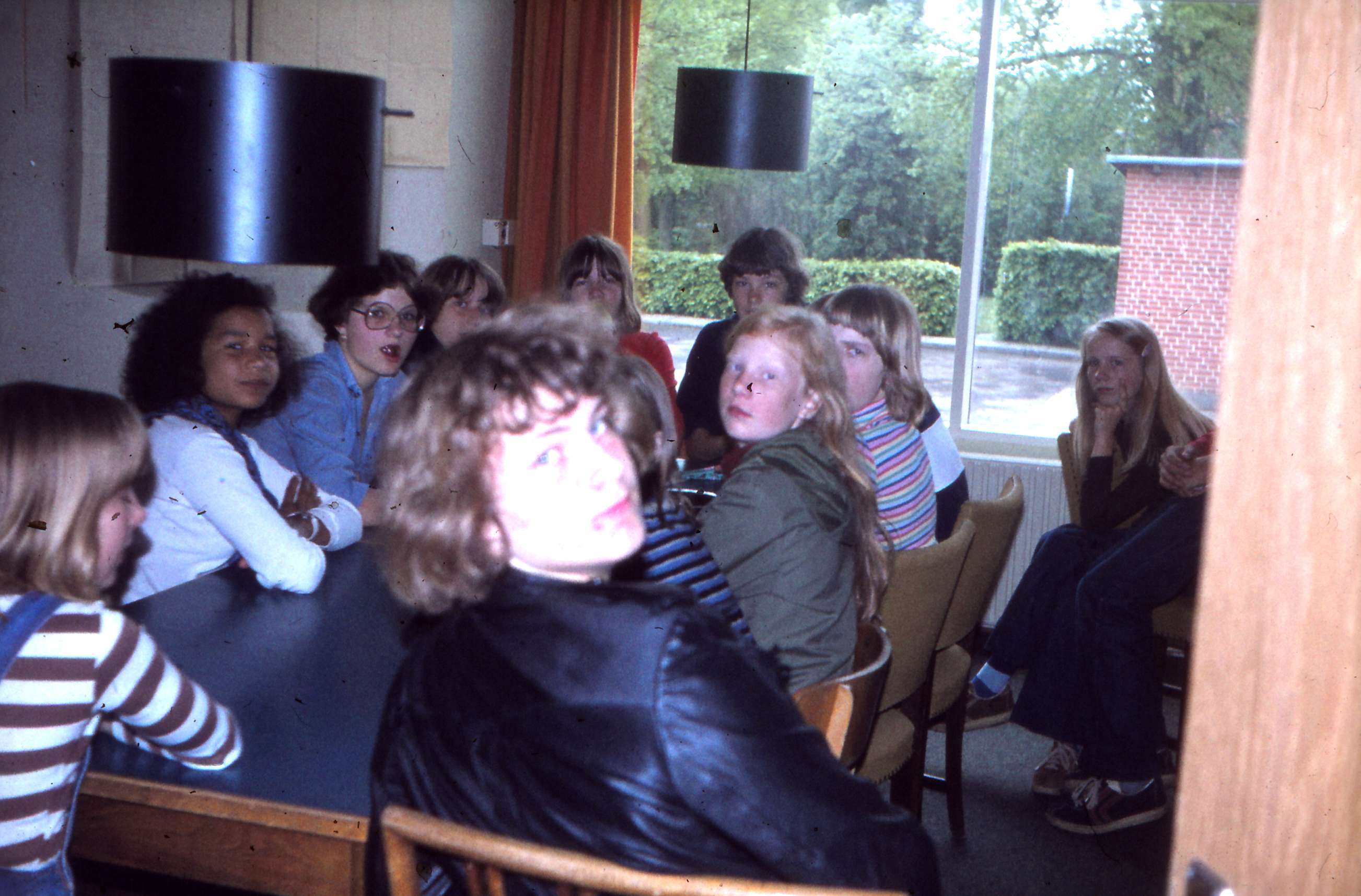 | Lærerværelse. Del af B klassen som gik ud af skolen sommeren 1980 efter 9. klasse. Louise Åstrøm oplyser oktober 2014, at det er elever fra min daværende klasse. Den mørke pige hedder Linda. Den rødhårede pige på højre side af bordet og som kigger på fotografen, hedder Trine. Til højre fra hende sidder Merete. Til venstre for Maibritt sidde jeg selv, Louise, og for bordenden sidder Katja. Til højre for hende i rød trøje er Karen og pigen, der sidder for sig selv med hånden under hagen er Lise. Forrest i billedet sidder en dreng, som jeg mener at genkende som Aage. Billed ID: B5294. Dias opbevares på Mårslet Egnsarkiv Registreret i Arkibas. | |||
