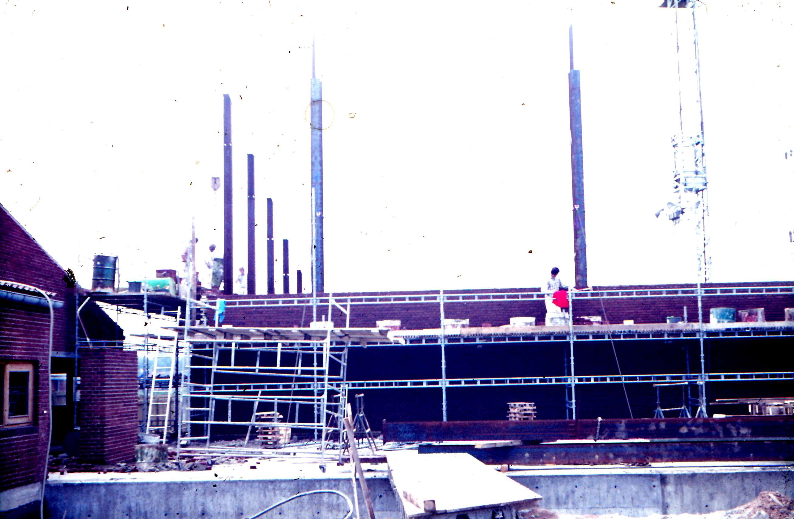 | Bygning af B-huset. Billed ID: B5304 . Dias opbevares på Mårslet Egnsarkiv Registreret i Arkibas. | |||