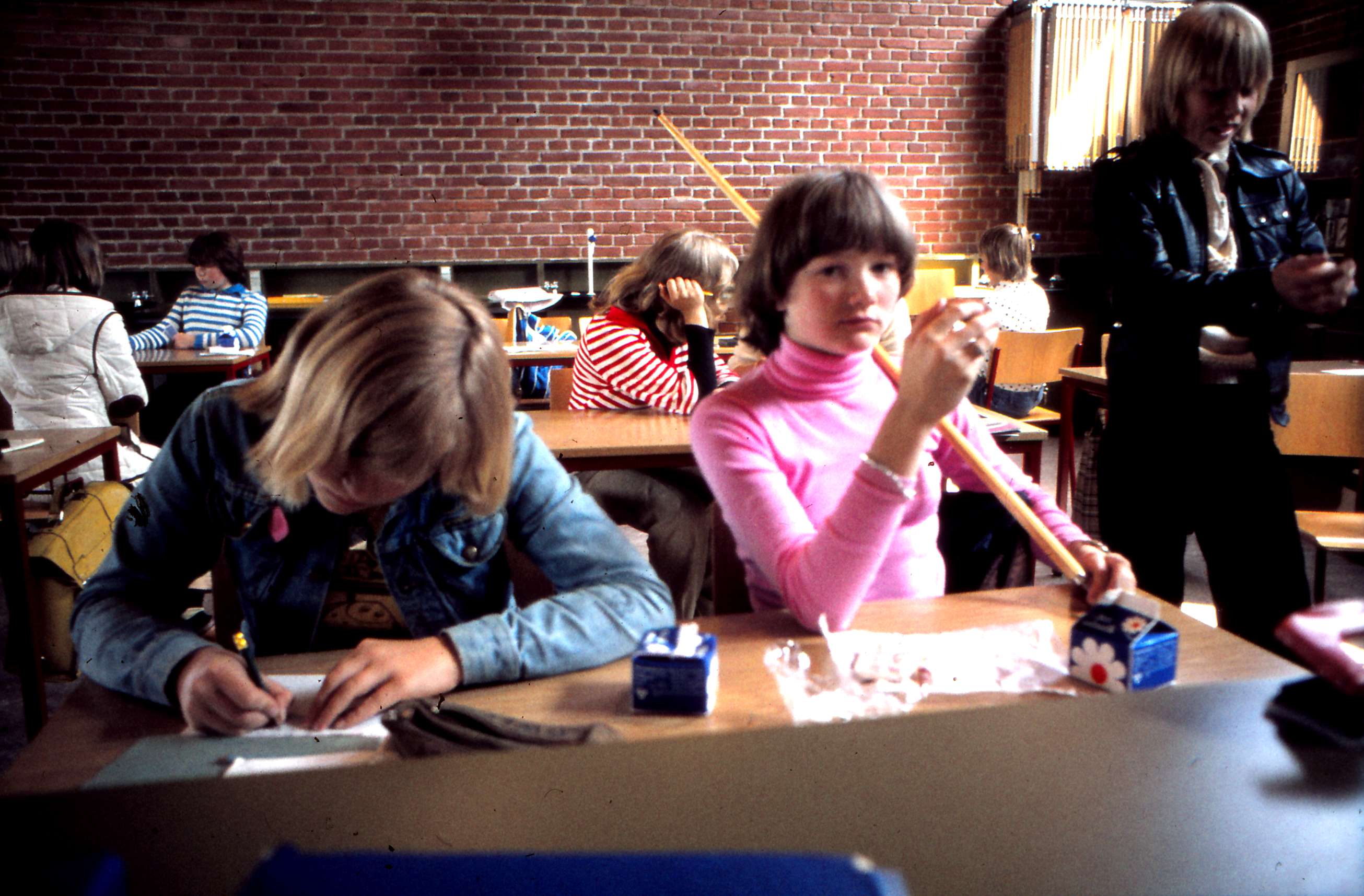 | Pause i en klasse i A-huset. Pia Benthe (Rasmussen?) i cowboyjakke Lone Kærgård i pink Morten Carlsen i læder. Billed ID: B5308 . Dias opbevares på Mårslet Egnsarkiv Registreret i Arkibas. | |||