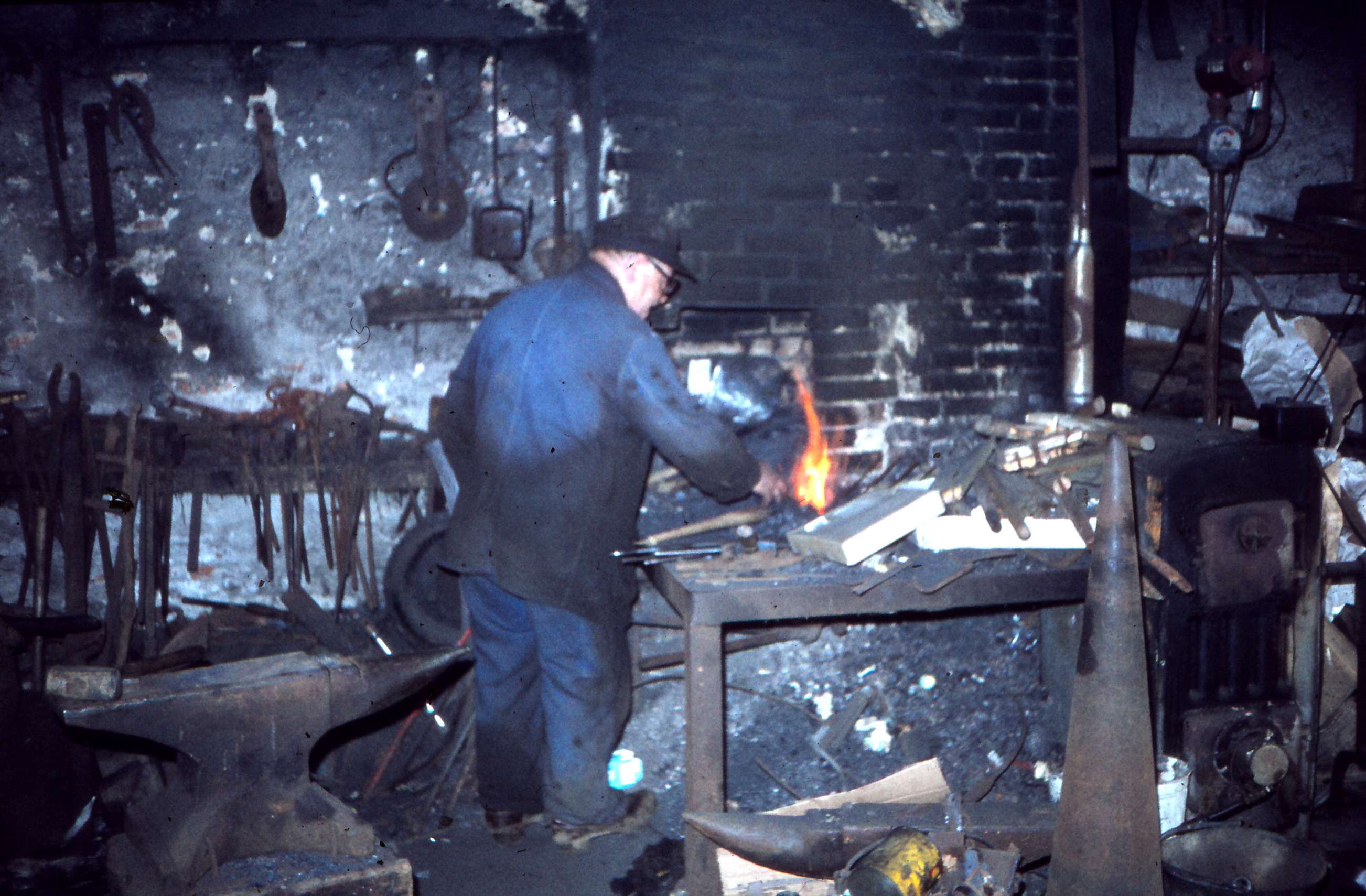 | Tandervej 8. Den gamle smedje. Ved essen ses smed Edvard Sørensen. . Billed ID: B5334. Dias opbevares på Mårslet Egnsarkiv Registreret i Arkibas. | |||