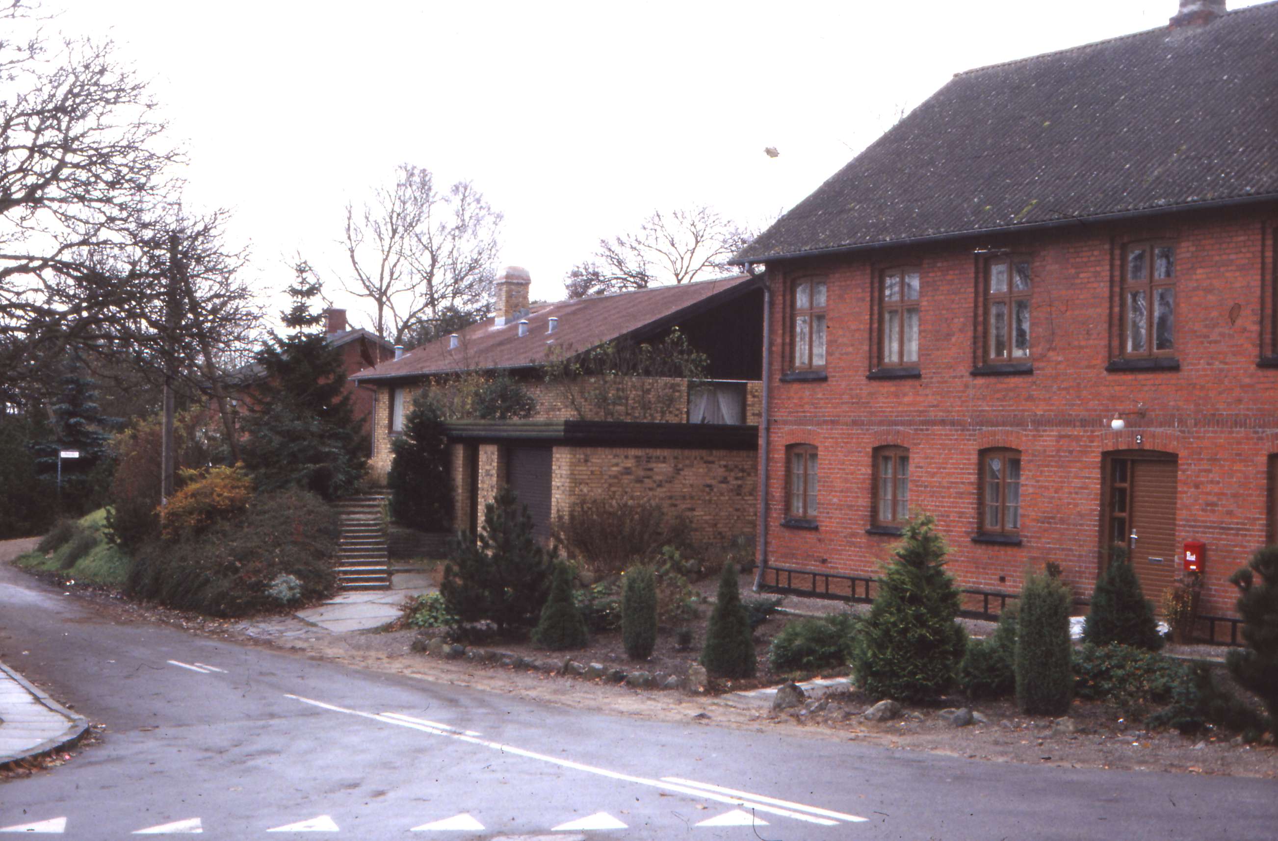 | Ejendommen til højre er Eskegårdsvej 2 der altid har været indrettet som et 2 familieshus. Det var i den ende længst ned i Eskegårdsvej som familien Madsen boede i, Else Madsen drev i mange år selvstændig frisørsalon fra stedet. Desuden boede Brændbyge i ejendommen og de ejede den. Det gule hus blev opført af Ingeniør Per Høgsted og Inger Høgsted. Mårslets børn var meget utilfredse med opførelsen af huset. Grunden har ligget indtil ca. 1970 som en ubebygget grund som børnene brugte som kælkebakke om vinteren og legeplads om sommeren. I dag bor tidligere Brugsuddeler Niels Poulsen i ejendommen sammen med sin kone Maibritt. Billed ID: B5341. Dias opbevares på Mårslet Egnsarkiv Registreret i Arkibas. | |||