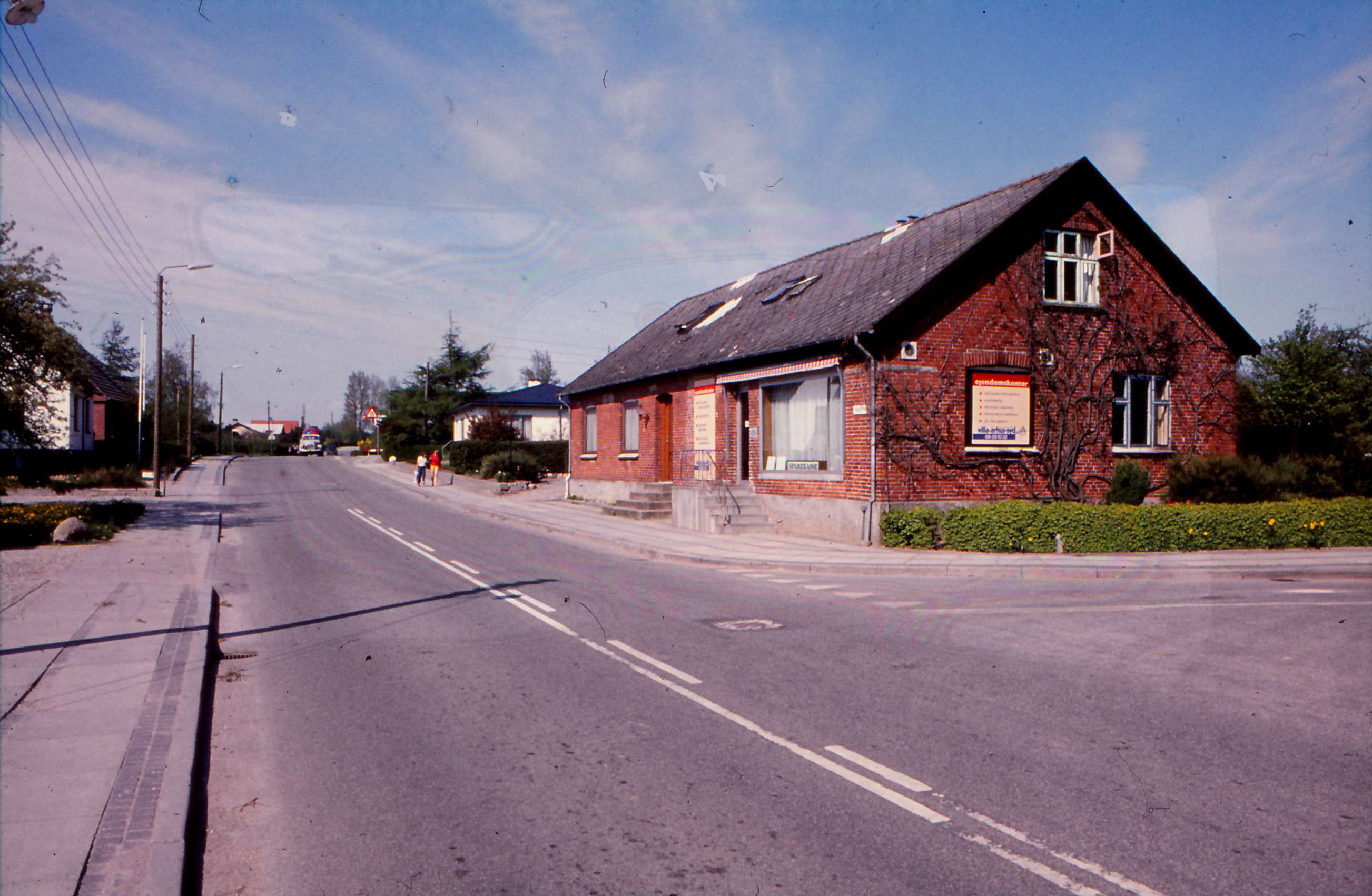 | Hørretvej. Til venstre indkørslen til 'Møllen', foderstofforretning, Hørretvej 25. Derefter Hørretvej 27, det hvide hus og Hørretvej 29. Til højre udmunding af Langballevej i Hørretvej. På hjørnet Hørretvej 26, ejendomskontor og derefter Hørretvej 28, bungalow, der i 1990 måtte vige for Lokalcenter Kildevangs gule ældreboliger langs Hørretvej. Billed ID: B5343. Dias opbevares på Mårslet Egnsarkiv Registreret i Arkibas. | |||
