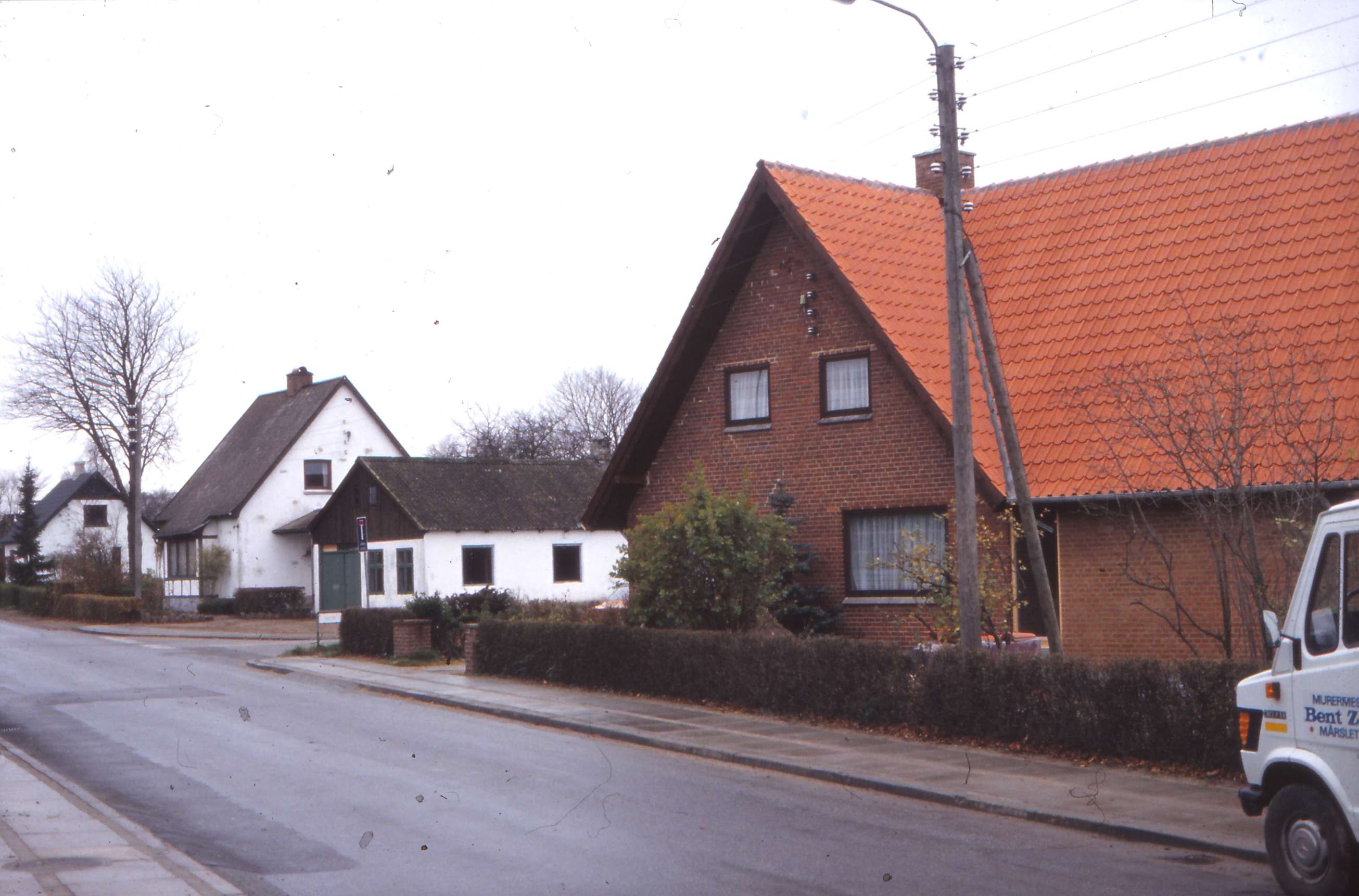 | Vejen til højre er Agervej. Rødstenshuset er Tandervej 22. Det hvide hus efter Agervej er Tandervej 24 og derefter Tandervej 28. Tandervej 26 ligger lidt tilbagetrukket og ses ikke bå billedet. Billed ID: B5345. Dias opbevares på Mårslet Egnsarkiv Registreret i Arkibas. | |||