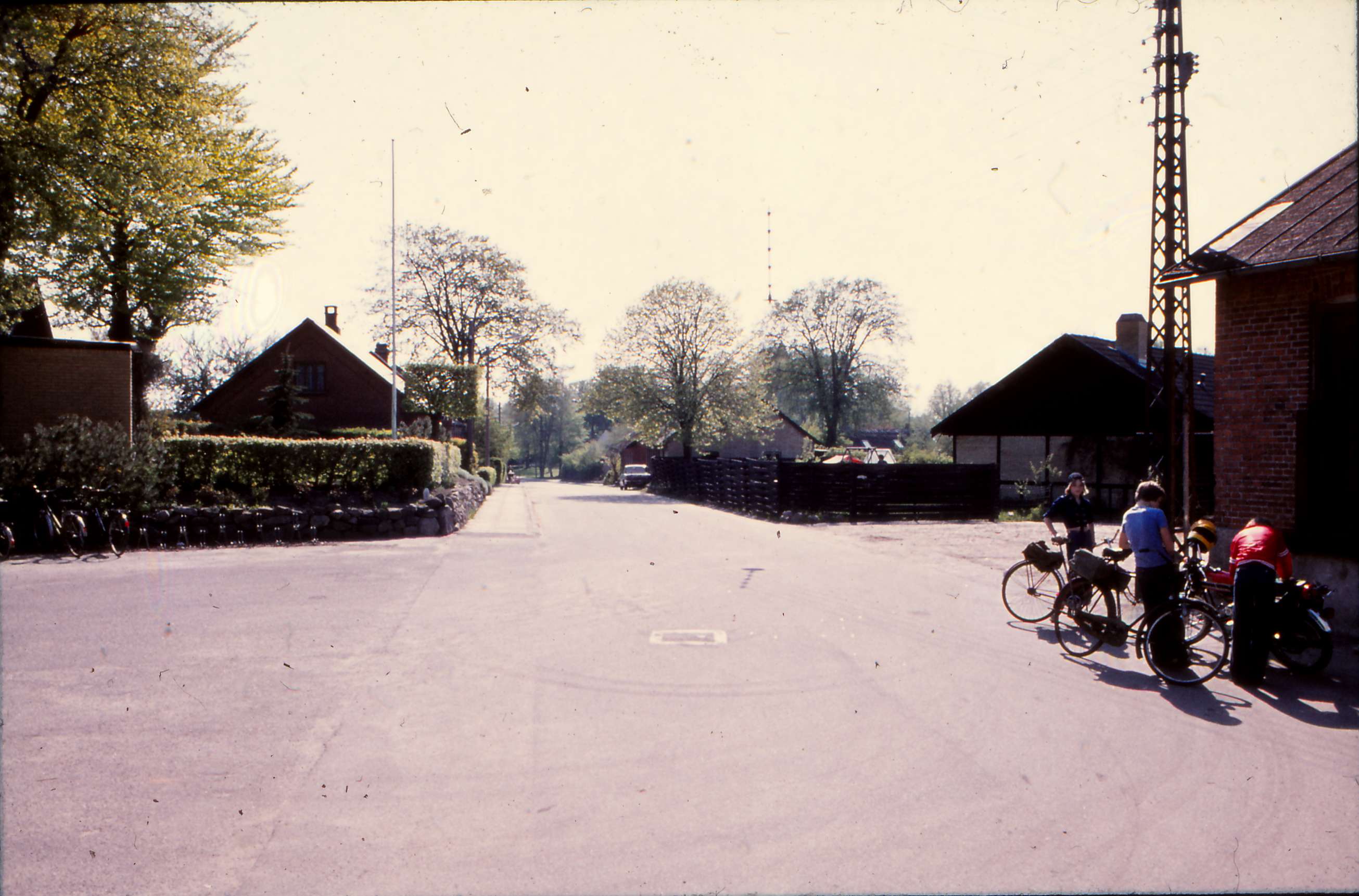 | Banevej. Banevej set fra pladsen ved stationen. Bygningen til højre er stationens Pakhus, nu nedrevet. Til højre ses Banevej 7. Til venstre ses træet foran Banevej 8 og derefter Banevej 6. Billed ID: B5352. Dias opbevares på Mårslet Egnsarkiv Registreret i Arkibas. | |||