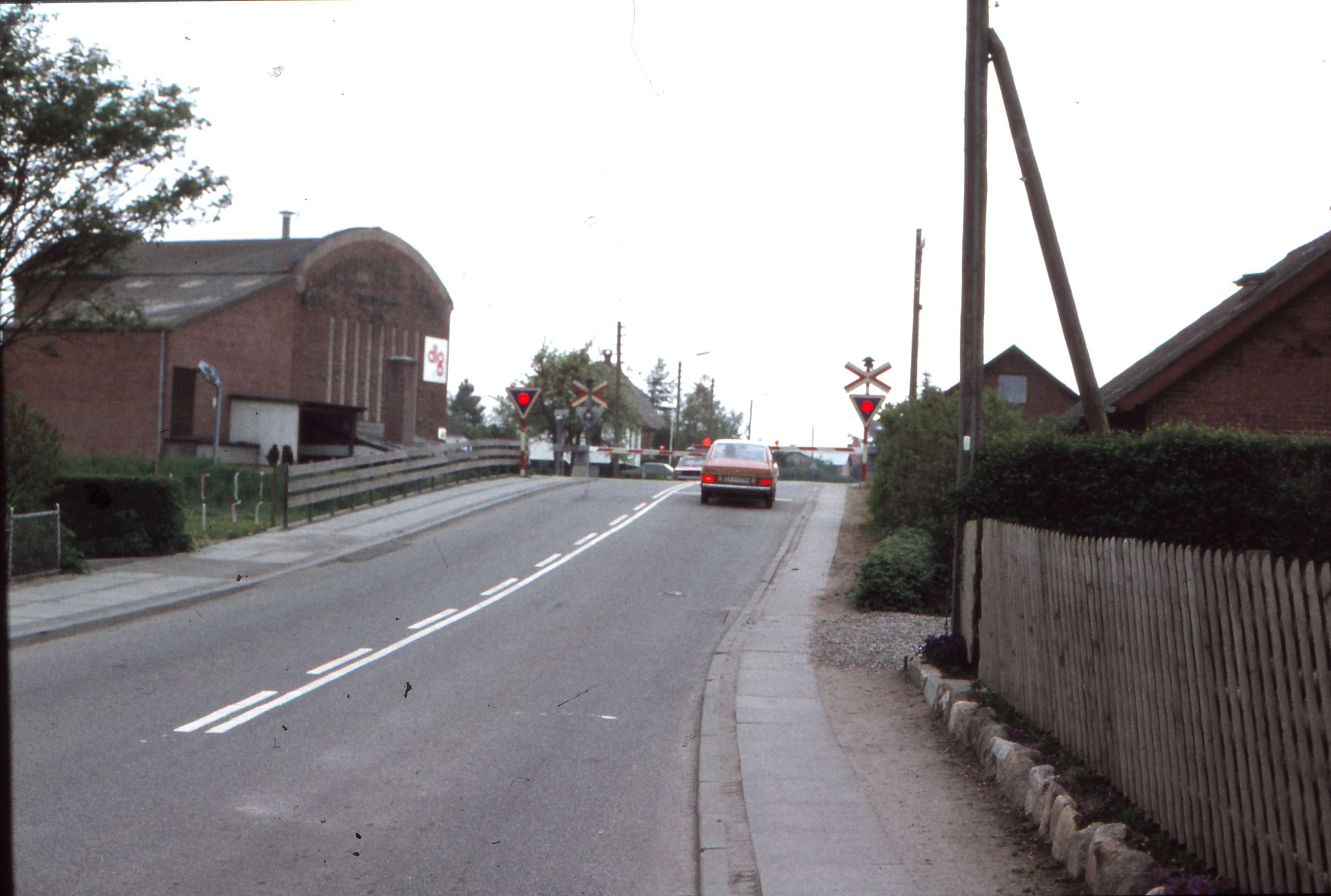 | Hørretvej. Til venstre Hørretvej 25, Foderstofforretningen Kildevang. Efter jernbaneoverskæringen ses Hørretvej 27. Til højre bag stakittet Hørretvej 20 og derefter Hørretvej 24. Efter overskæringen ses Hørretvej 26. Billed ID: B5372. Dias opbevares på Mårslet Egnsarkiv Registreret i Arkibas. | |||
