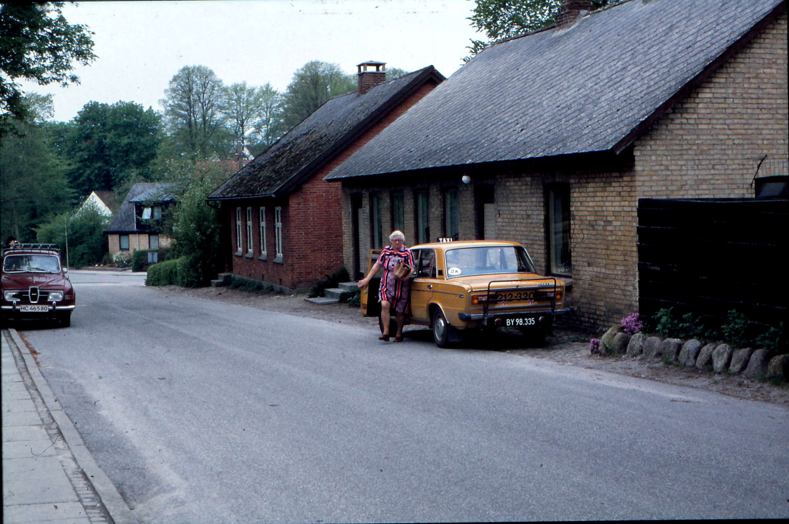 | Banevej. Mårslet Taxi holder uden for Ragna Andersen's bopæl: Banevej 5. På billedet ses også Banevej 1. Til venstre i billedet holder Per Enevoldsens SAAB uden for hans hus. Bagest på billedet ses Hørretvej 9, huset med kvisten og gavlen af kapellet. Billed ID: B5374. Dias opbevares på Mårslet Egnsarkiv Registreret i Arkibas. | |||