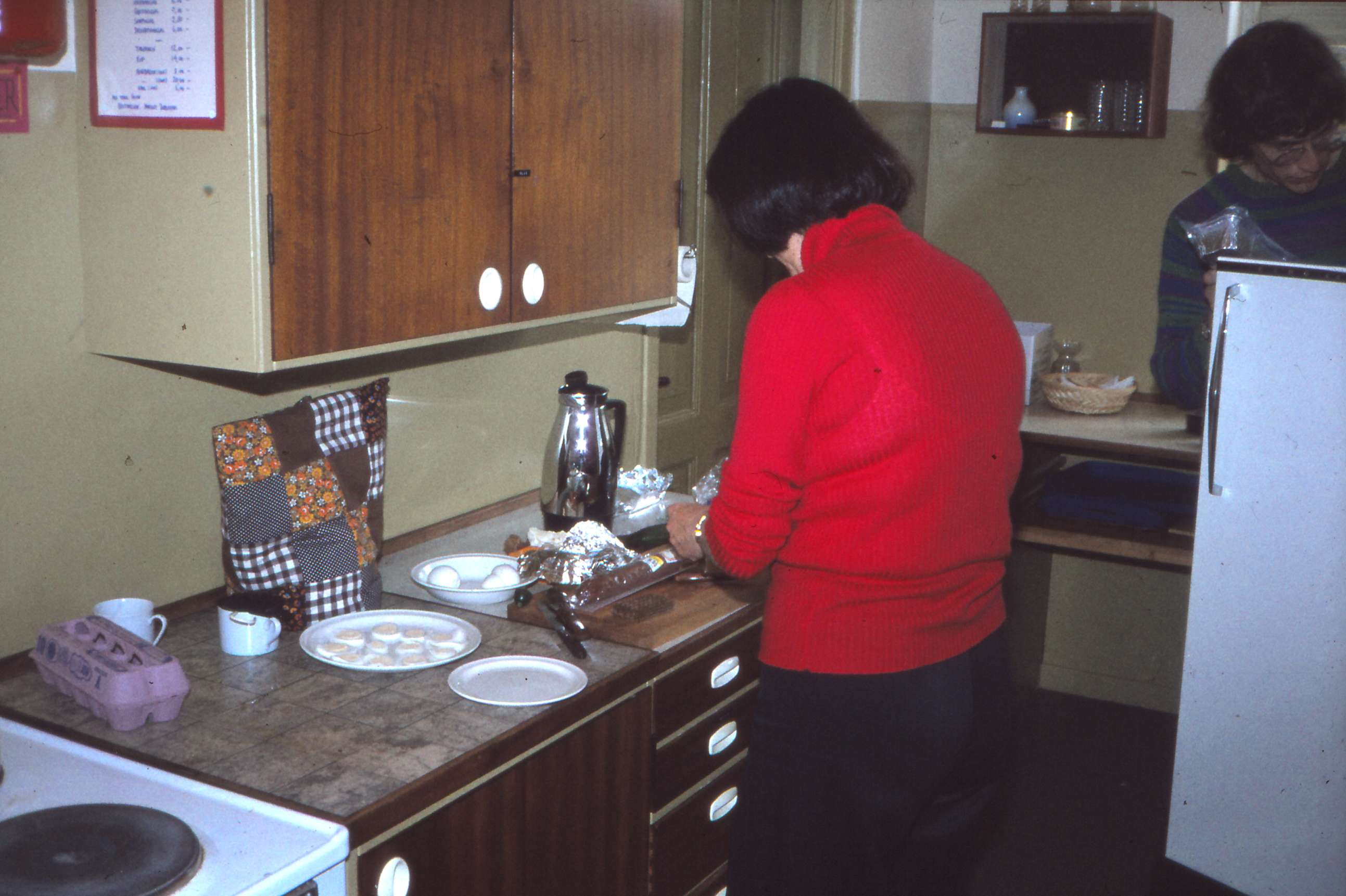 | Banevej. Borgerhuset. Børnehuset Valnødden bor til leje i Borgerhuset. Køkkenet som ses på billedet stammede tilbage til dengang kæmneren havde huset som sin privatbolig. Der anrettes frokost til børnene. Billed ID: B5385. Dias opbevares på Mårslet Egnsarkiv Registreret i Arkibas. | |||