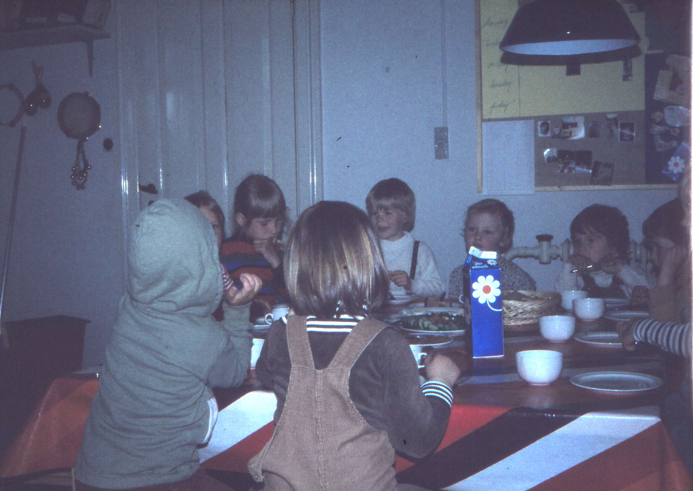 | Banevej. Borgerhuset. Børnehuset Valnødden bor til leje i Borgerhuset. Køkkenet stammede tilbage til dengang kæmneren havde huset som sin privatbolig. Børnene spiser frokost. Billed ID: B5387. Dias opbevares på Mårslet Egnsarkiv Registreret i Arkibas. | |||