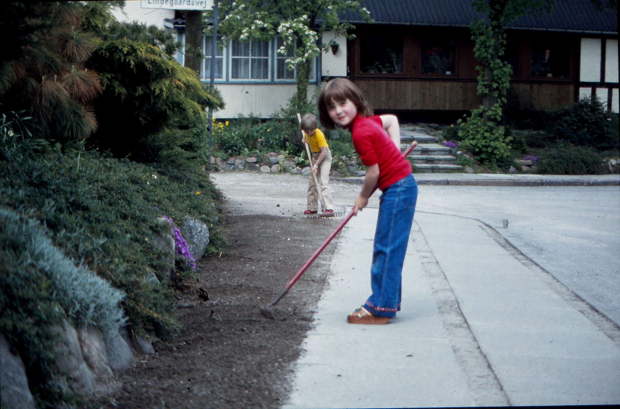 | Mårslet. Tandervej. Lugning på hjørnet af Tandervej og Lindegårdsvej. Tandervej 12 hos maler Erik Svejborg. Bagved ses Tandervej 10. Gartnerne er forrest Hanne Fuglsang og bagerst Trine Svejborg. Oplyst af Lene Svejborg 3. august 2012. Billed ID: B5408. Dias opbevares på Mårslet Egnsarkiv Registreret i Arkibas. | |||
