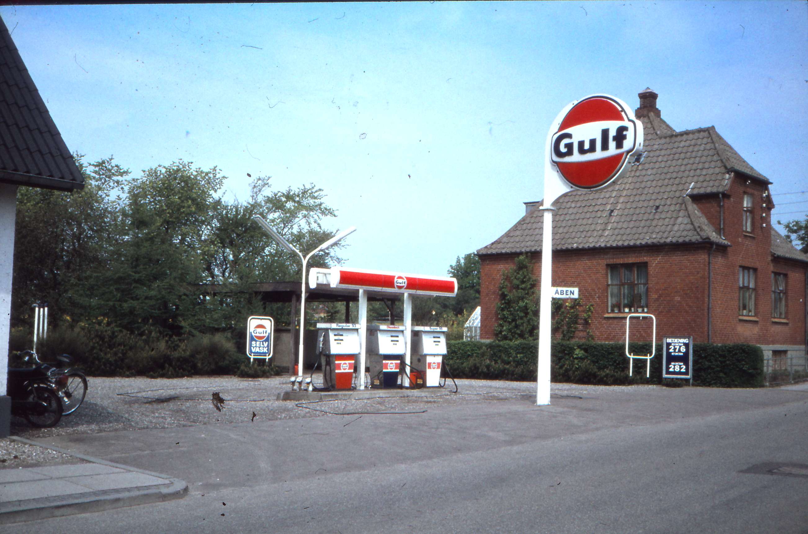 | Hørretvej 17. Gulf tanken. Benzinpris: 2,76 kr oktan 93 og 2,82 kr for oktan 99. AK JA. Ejendommen Hørretvej 17 har igennem en lang årrække huset familien Larsen. Først var det den gamle A. P. Larsen der drev cykelforretning, Skærsliberforretning og senere fik benzin. Sidenhen var det sønnen Aage Larsen der drev forretningen videre. Efter Aages død i 1971 drev Aages kone Inger forretningen alene uden nogen fridage. Inger Larsen havde først Gulf station. Tanken ændrede sidenhen navn til Q8. Tanken blev lukket den 14. november 1995. Inger havde fået lovning på betaling af en evt. oprensning, såfremt tanken havde lukket inden årsskiftet. Dette tilbud benyttede Inger sig af og lukkede tanken. Billed ID: B5422. Dias opbevares på Mårslet Egnsarkiv Registreret i Arkibas. | |||