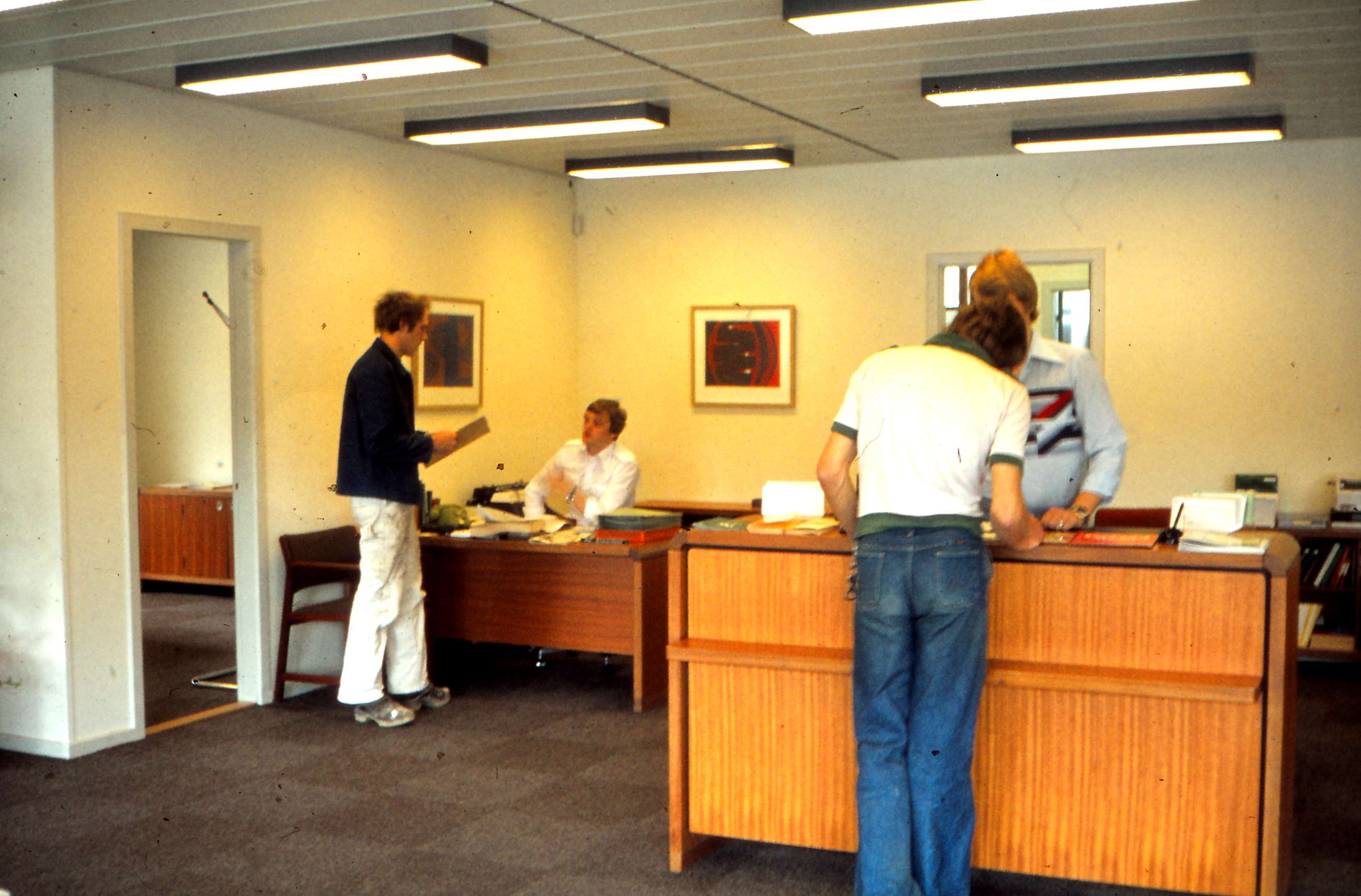 | Tandervej 6. Interiør fra Provinsbanken. Til venstre ses bankbestyrer Per Enevoldsen tale med malermester Erling Dybvad. Til højre ses bankassistent Peter Holm Simonsen i snak med en kunde. Peter Holm Simonsen led en krank skæbne. Efter et diskoteksbesøg på diskotek Tordenskjold i Århus kørte han sammen med en flok kammerater til Moesgaard for at bade. Peter kom i som den første med et hovedspirng fra broen og sprang ud på lavt vand og brækkede ryggen og blev lam. Han døde i 2010, 50 år gammel, efter et fald med sin kørestol fra en defekt kørestolsrampe på Casino Royal. Billed ID: B5428. Dias opbevares på Mårslet Egnsarkiv Registreret i Arkibas. | |||
