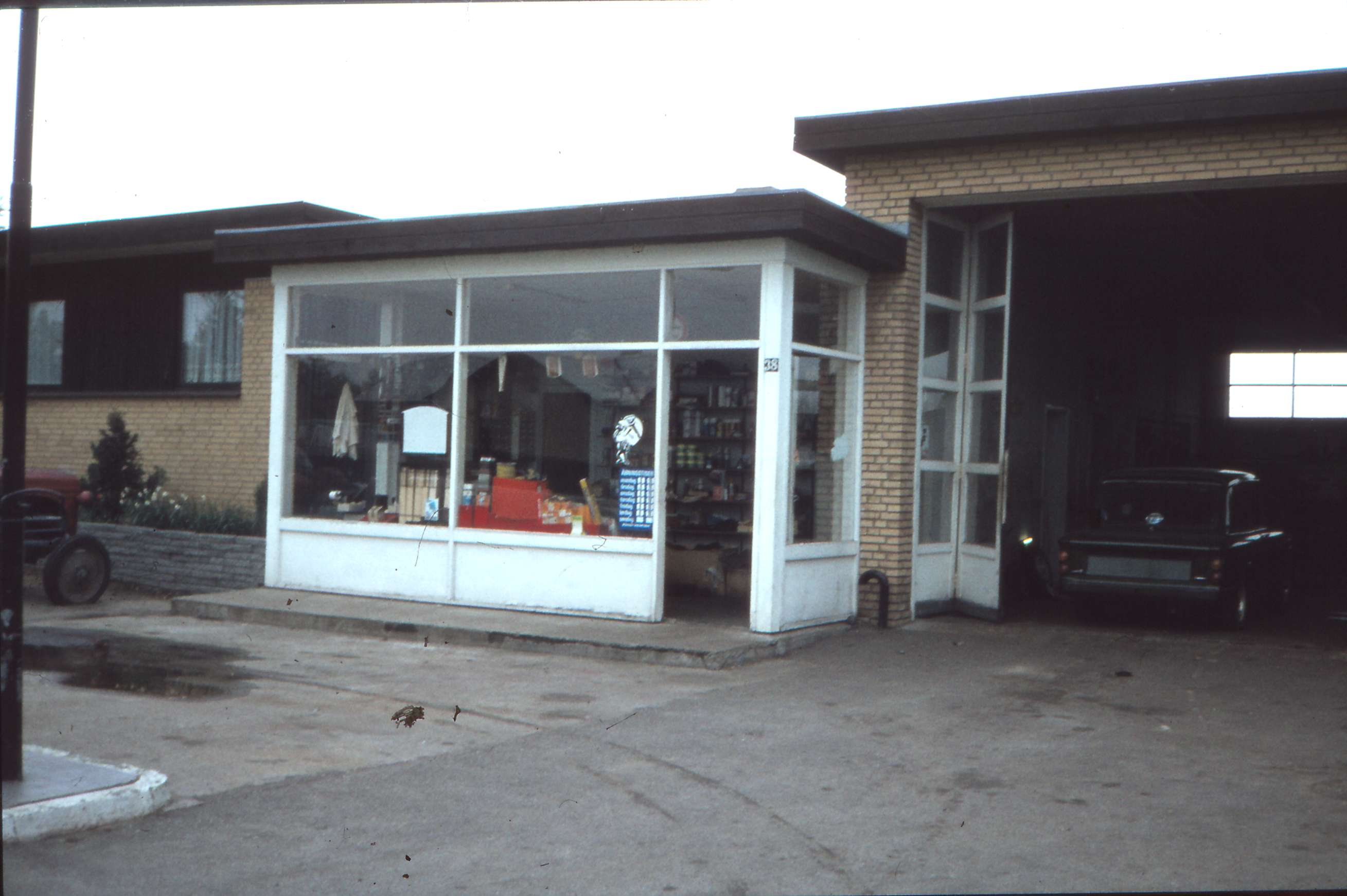 | Hørretvej 38. Autoværksted ejet af Verner Nielsen, der privat boede i huset ved siden af værkstedet. Verner handlede også med benzin. Billed ID: B5430. Dias opbevares på Mårslet Egnsarkiv Registreret i Arkibas. | |||