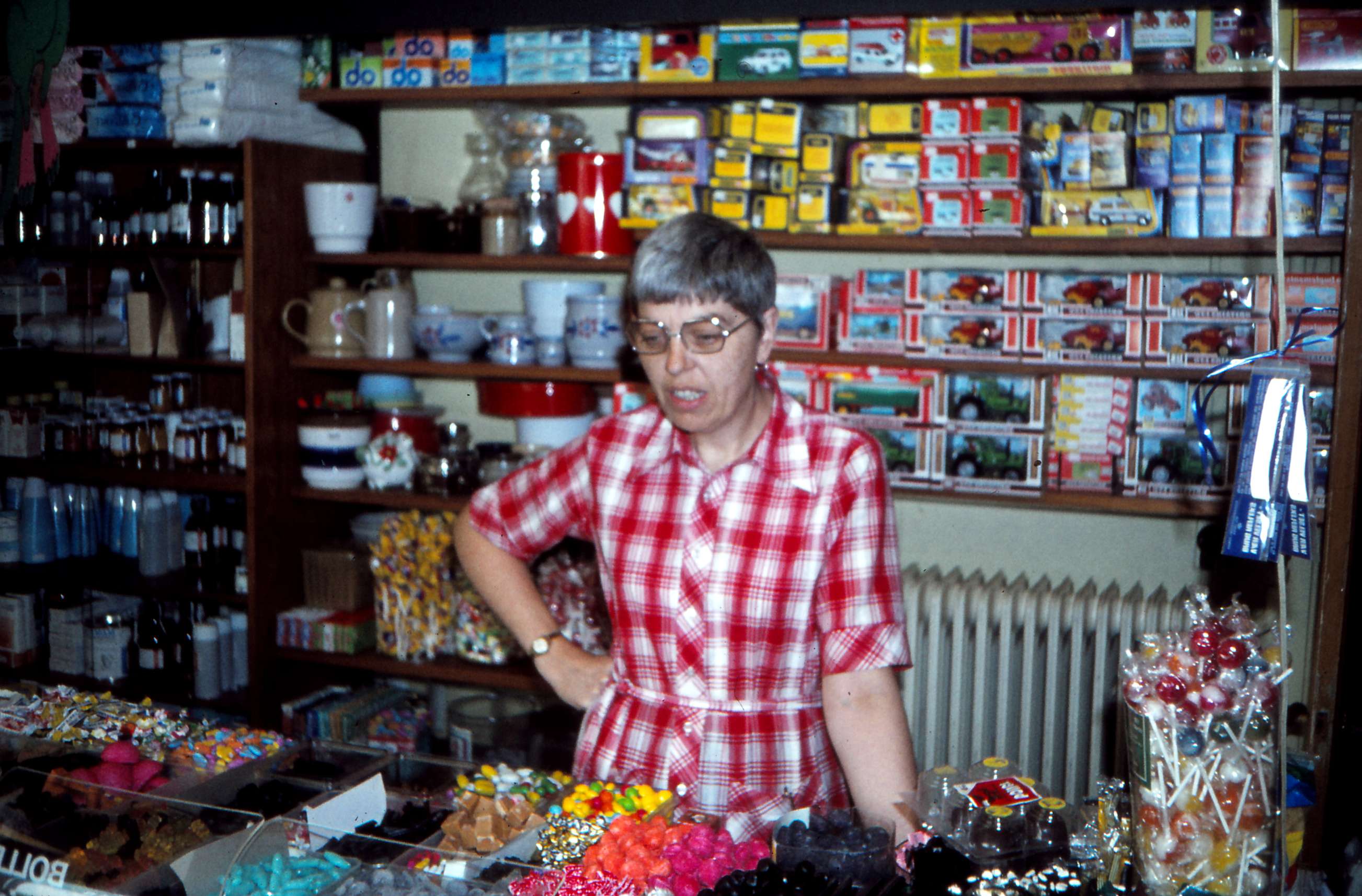 | Hørretvej 1. 'Justers butik'. Lis With bag disken med et stort udvalg af slik. På hylderne var der et meget stort udvalg af forskellige fornødenheder. Lis havde forhandling af Tips og Lotto som den eneste i byen, desuden var der håndkøbsudsalg for Marselisborg Apotek. Man kunne også hente receptpligtigt medicin i forretningen. Billed ID: B5437. Dias opbevares på Mårslet Egnsarkiv Registreret i Arkibas. | |||