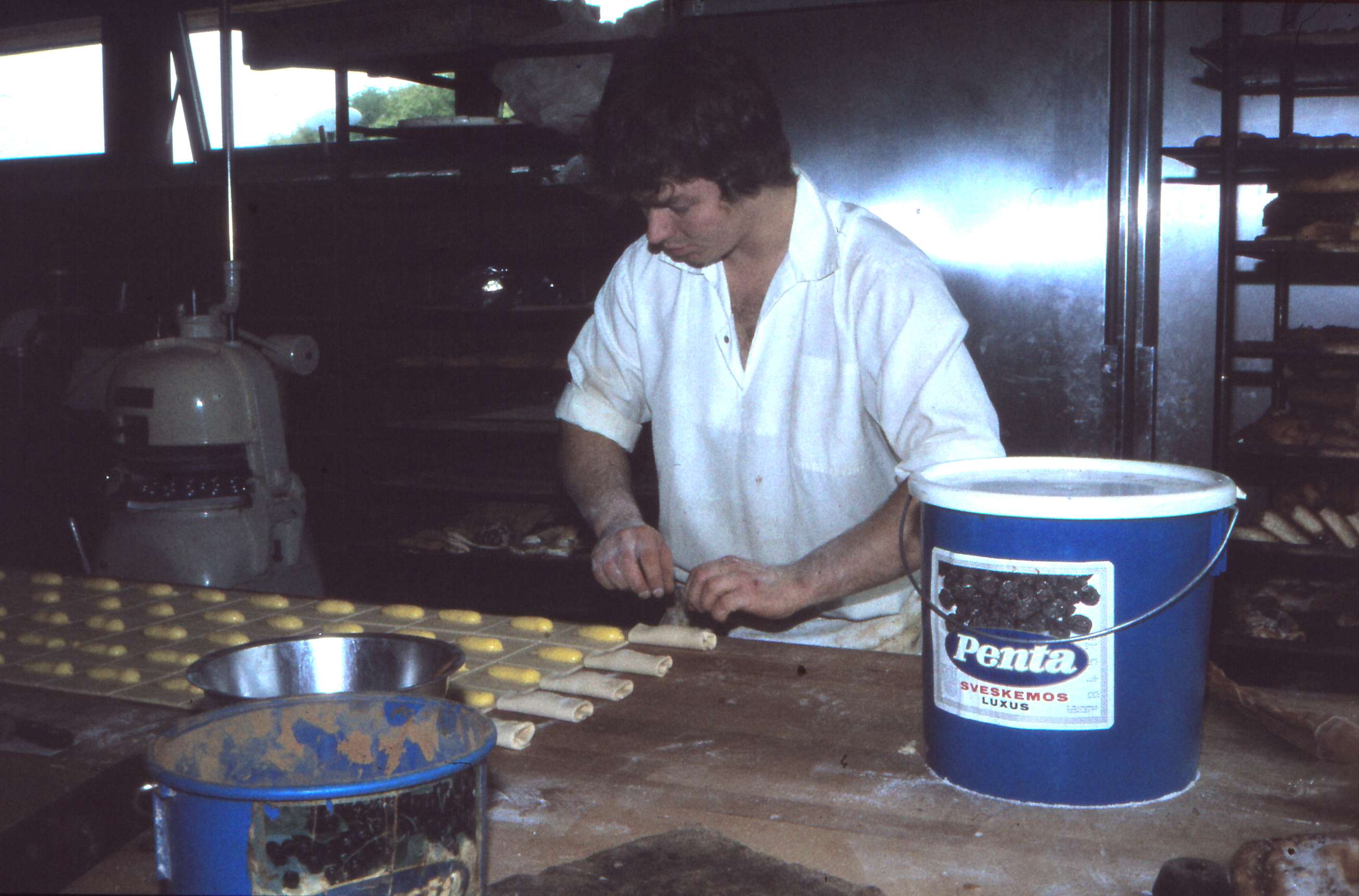 | Hørretvej 8. Bagerbutikken på butikstorvet. På billedet ses bager Bent Nielsen. Bent stammede fra smørhullet, han er i dag bager i Norge. Billed ID: B5447. Dias opbevares på Mårslet Egnsarkiv Registreret i Arkibas. | |||