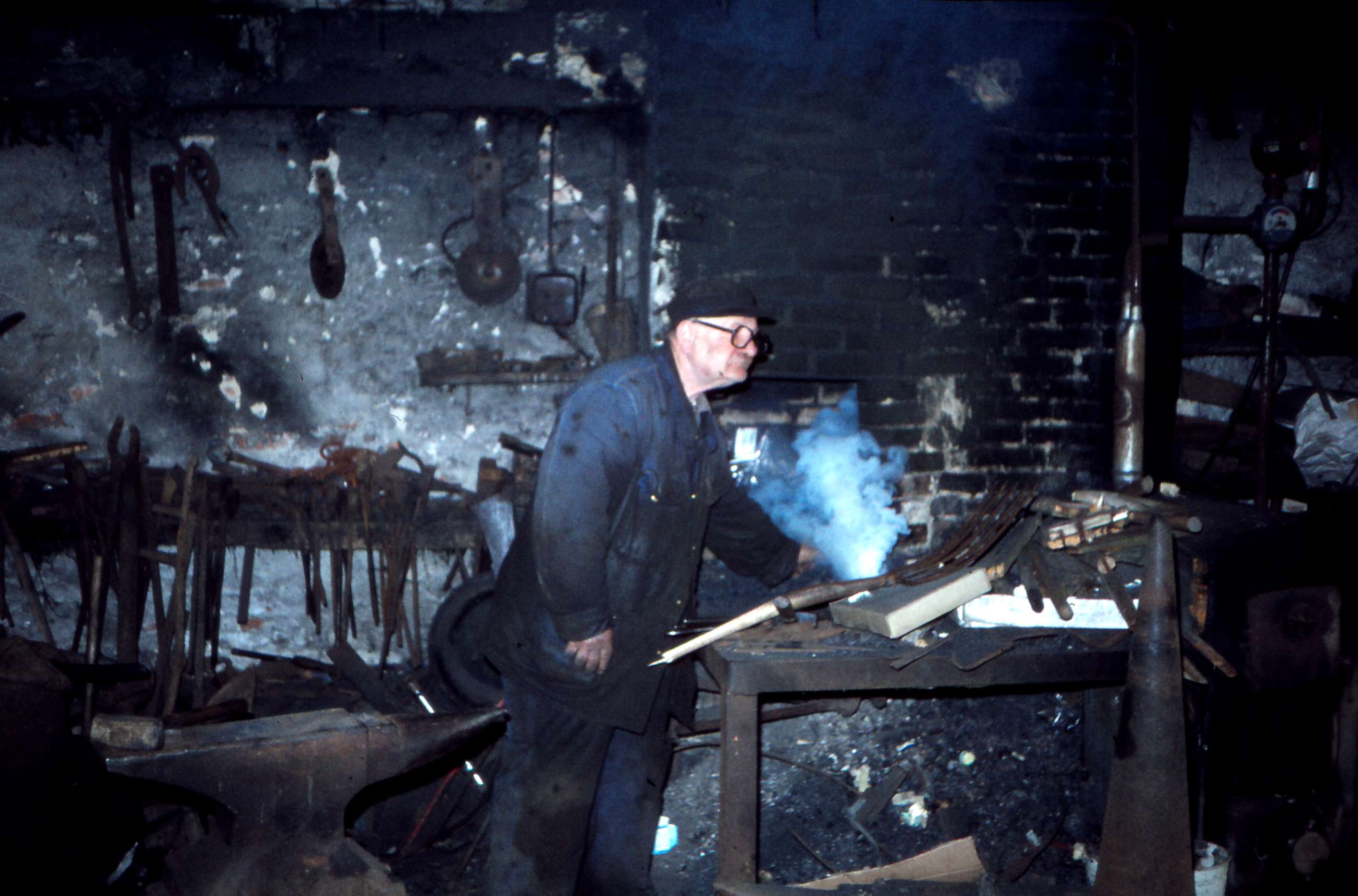 | Tandervej 8. Smedjen. Edvard Sørensen ved essen. Billed ID: B5463. Dias opbevares på Mårslet Egnsarkiv Registreret i Arkibas. | |||