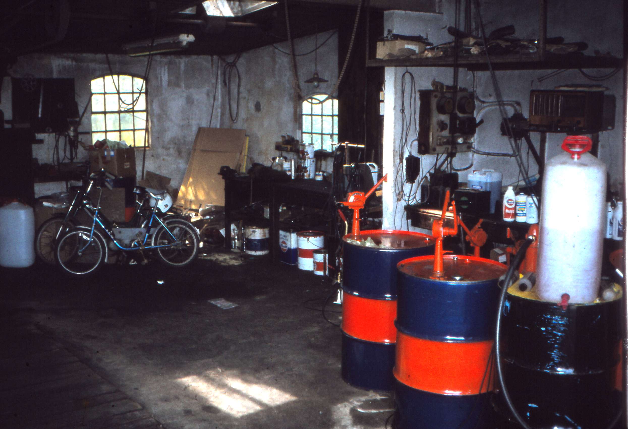 | Mårslet. Hørretvej 17. Et kik ind i værkstedet. Fra ejendommen drev A. P. Larsen og sønnen Aage Larsen bl. a. benzinsalg. Til ejendommen hørte også et værksted med smørregrav. Efter Aages død i 1971 fortsatte Inge Larsen med benzinsalget og salg af diverse driftsmidler til biler og knallerter. Benzinstationen solgte første Nafta og Shell benzin. Fra 1957 var det Gulf, som i 1981 blev opkøbt af Q8. Først i 1986 blev Gulf-skiltene udskiftet med Q8-skilte og -standere. På bagvæggen ses apparatur til opladning af akkumulatorer. Tanken lukkede i 1995. Billed ID: B5464. Dias opbevares på Mårslet Egnsarkiv Registreret i Arkibas. | |||