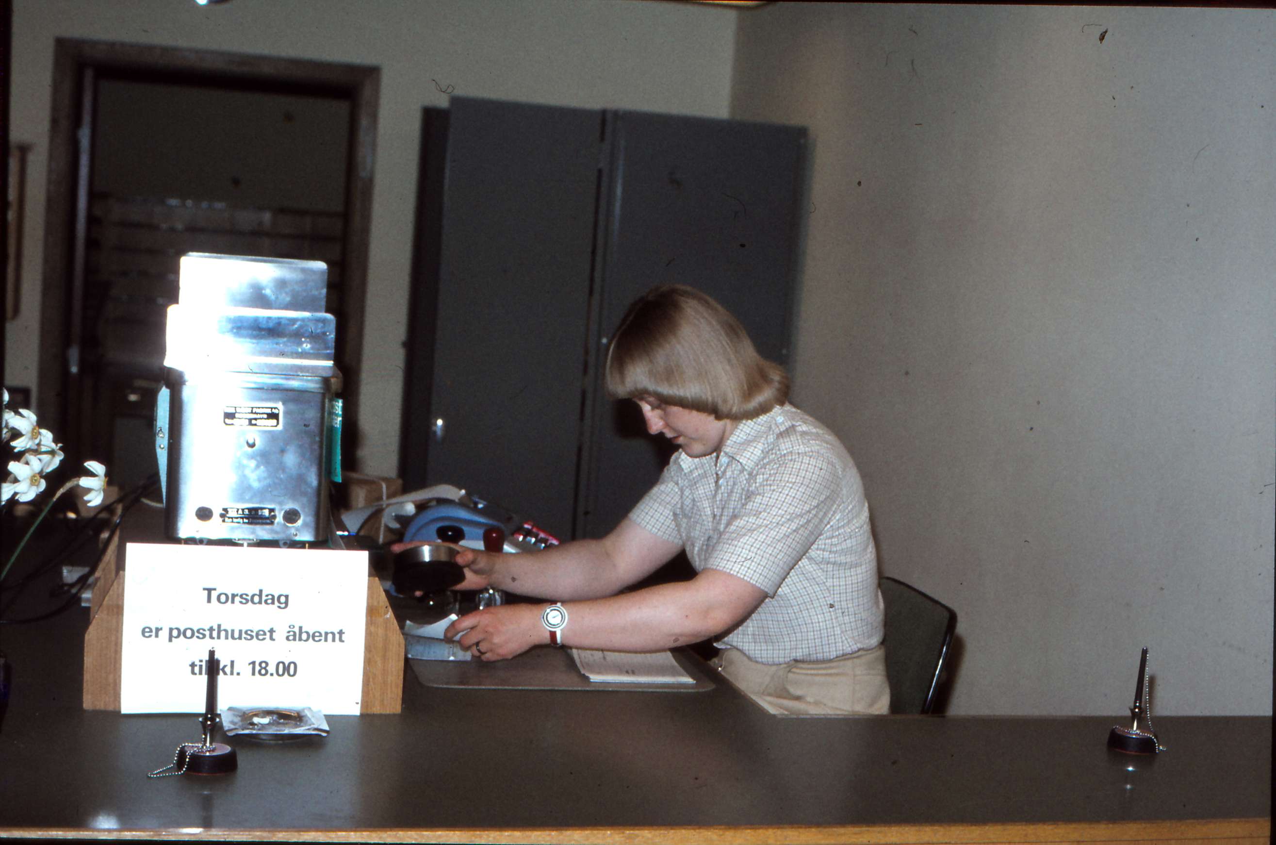 | Mårslet. Posthuset i Stationsbygningen. På billedet ses Birthe Vester? Billed ID: B5473. Dias opbevares på Mårslet Egnsarkiv Registreret i Arkibas. | |||