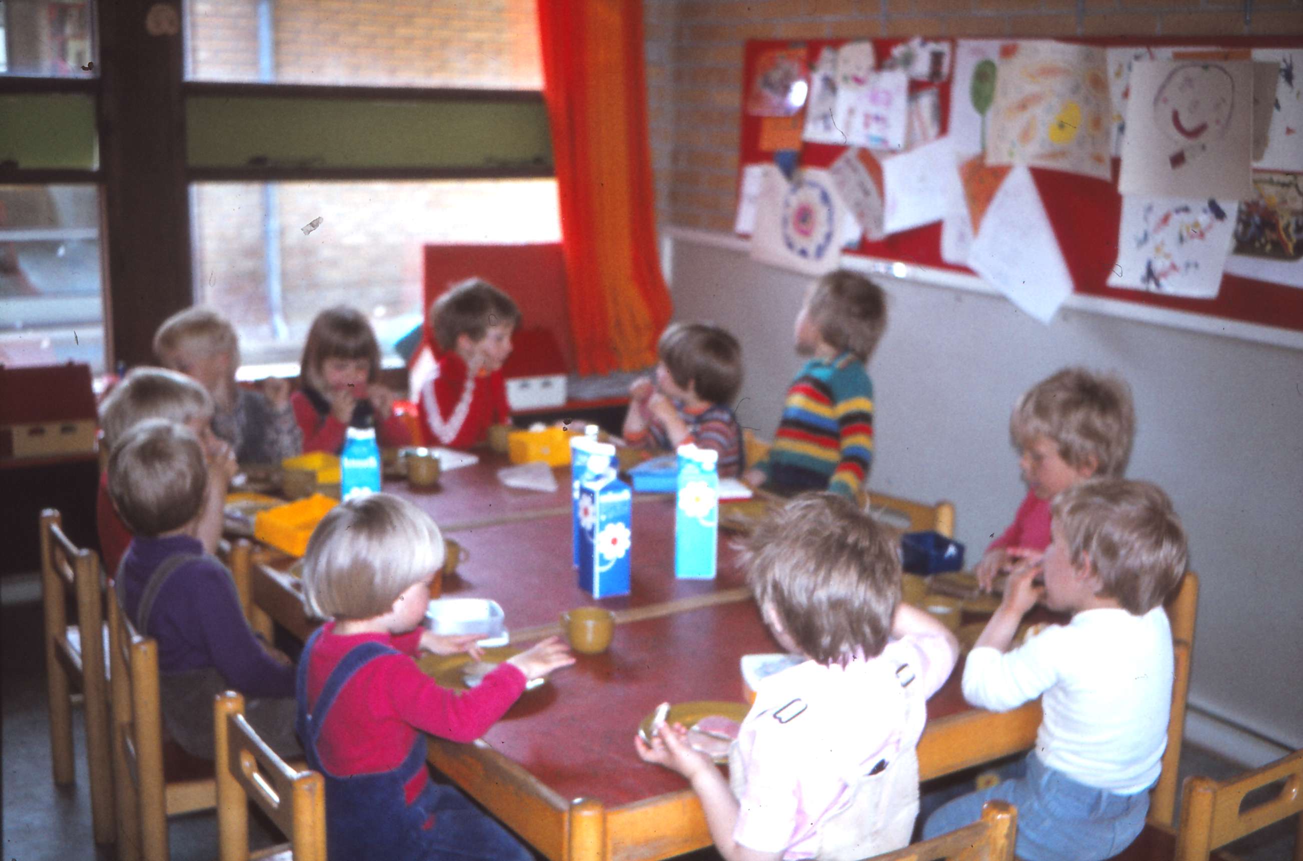 | Børnene er samlet til frokost. Billed ID: B5487. Dias opbevares på Mårslet Egnsarkiv Registreret i Arkibas. | |||