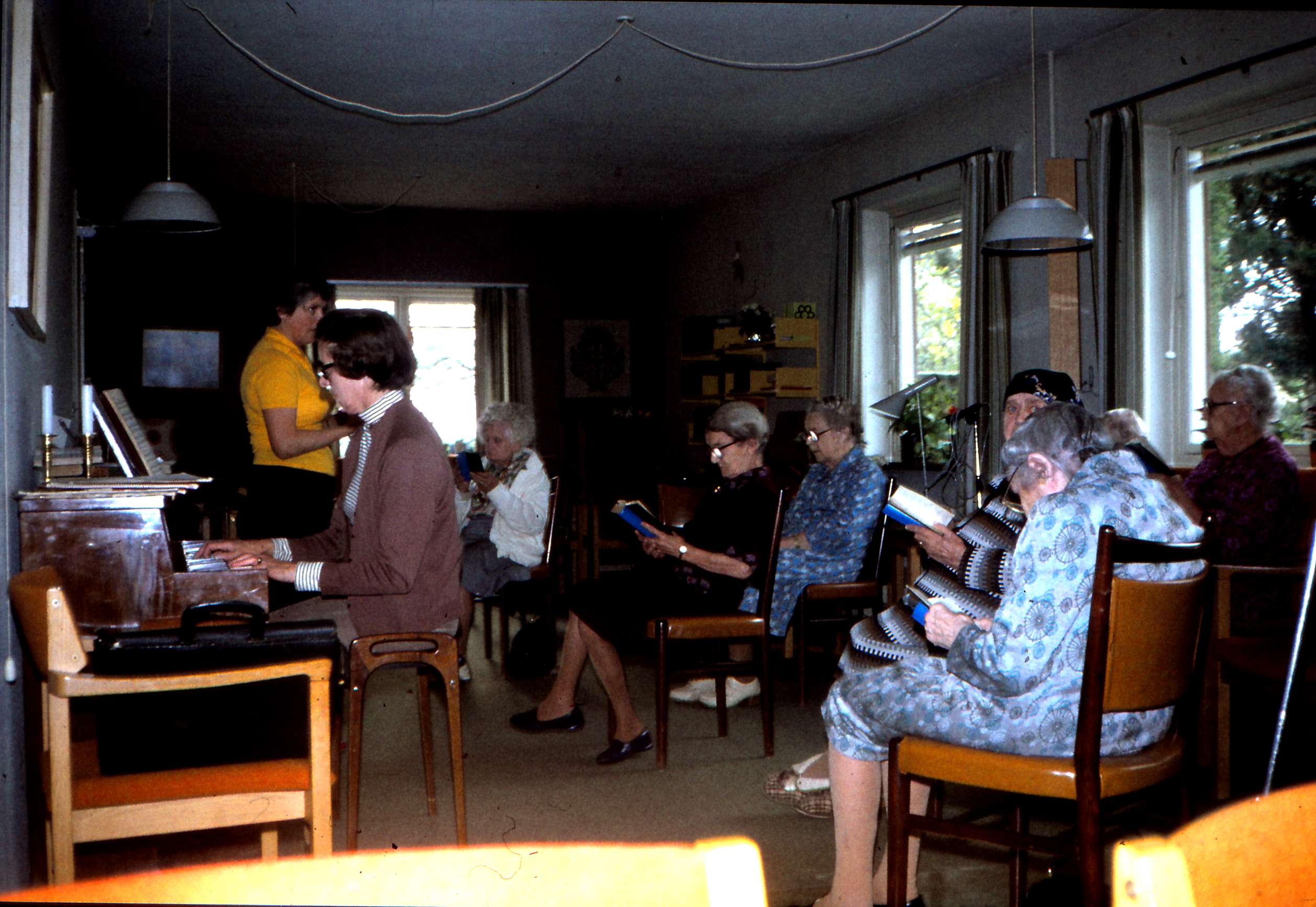 | Langballevej 3. Mårslet Plejehjem & Pensionistcenter. Fællessang i opholdsstuen. På billedet ses? Billed ID: B5538. Dias opbevares på Mårslet Egnsarkiv Registreret i Arkibas. | |||