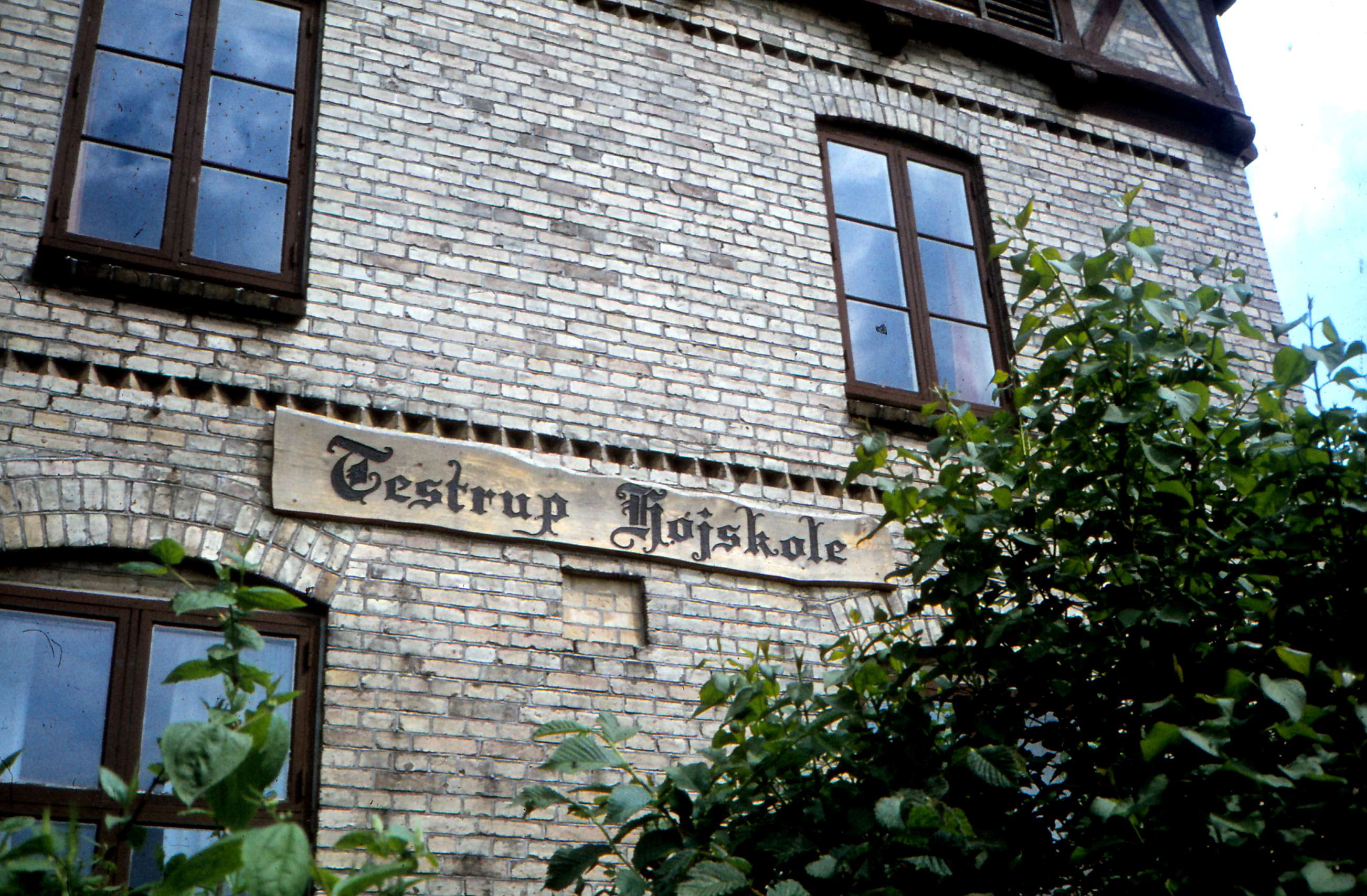 | Testrup Højskole. Tårnet med navneskilt i træ. Billed ID: B5553. Dias opbevares på Mårslet Egnsarkiv Registreret i Arkibas. | |||