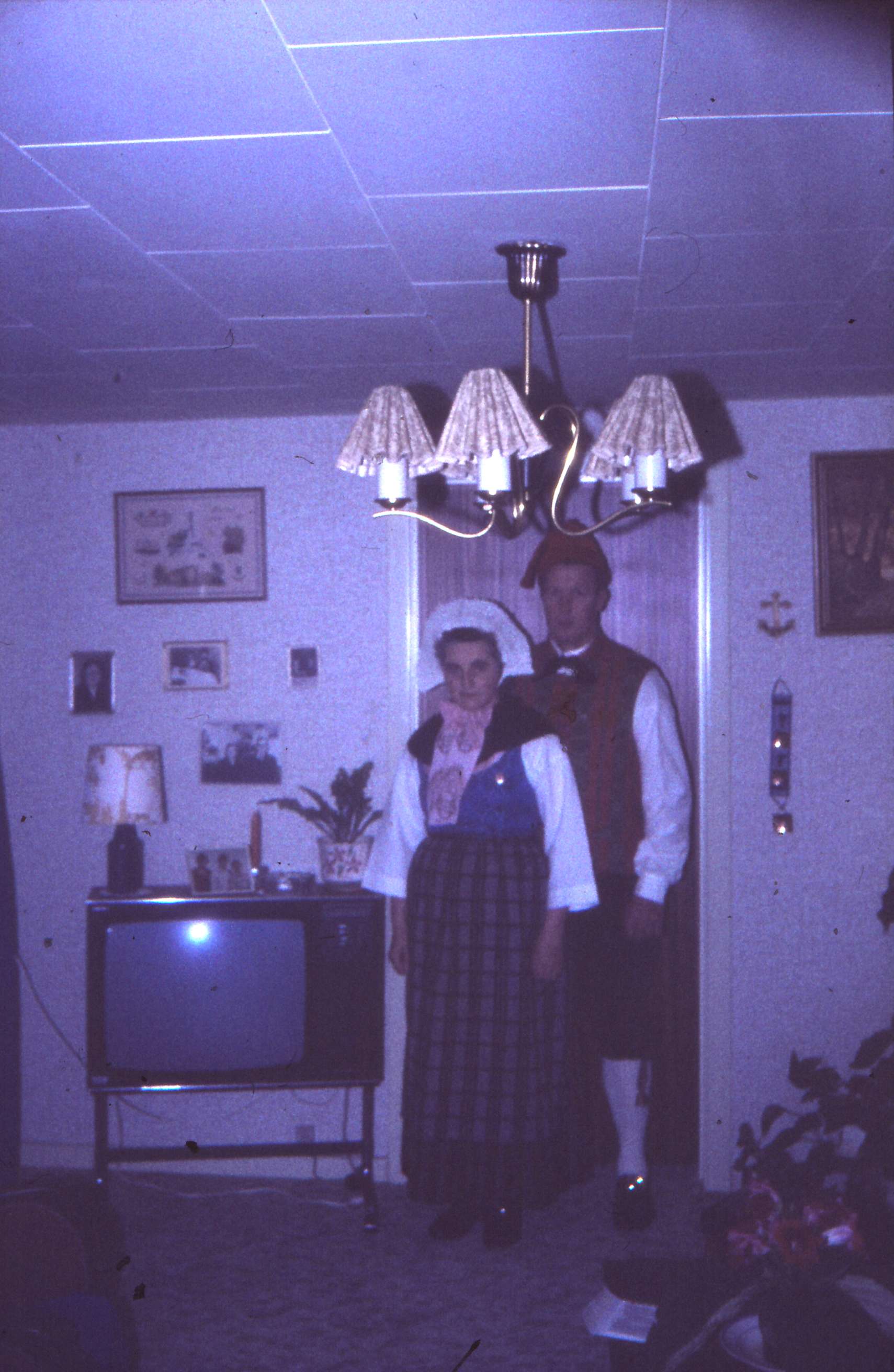 | Hvor? Nymarksvej? Elev Jørgen Tornbjergs hjem i Nymarken. På billedet ses Irene Tornbjerg og Børge Tornbjerg i folkedansedragt. Billed ID: B5576. Dias opbevares på Mårslet Egnsarkiv Registreret i Arkibas. | |||