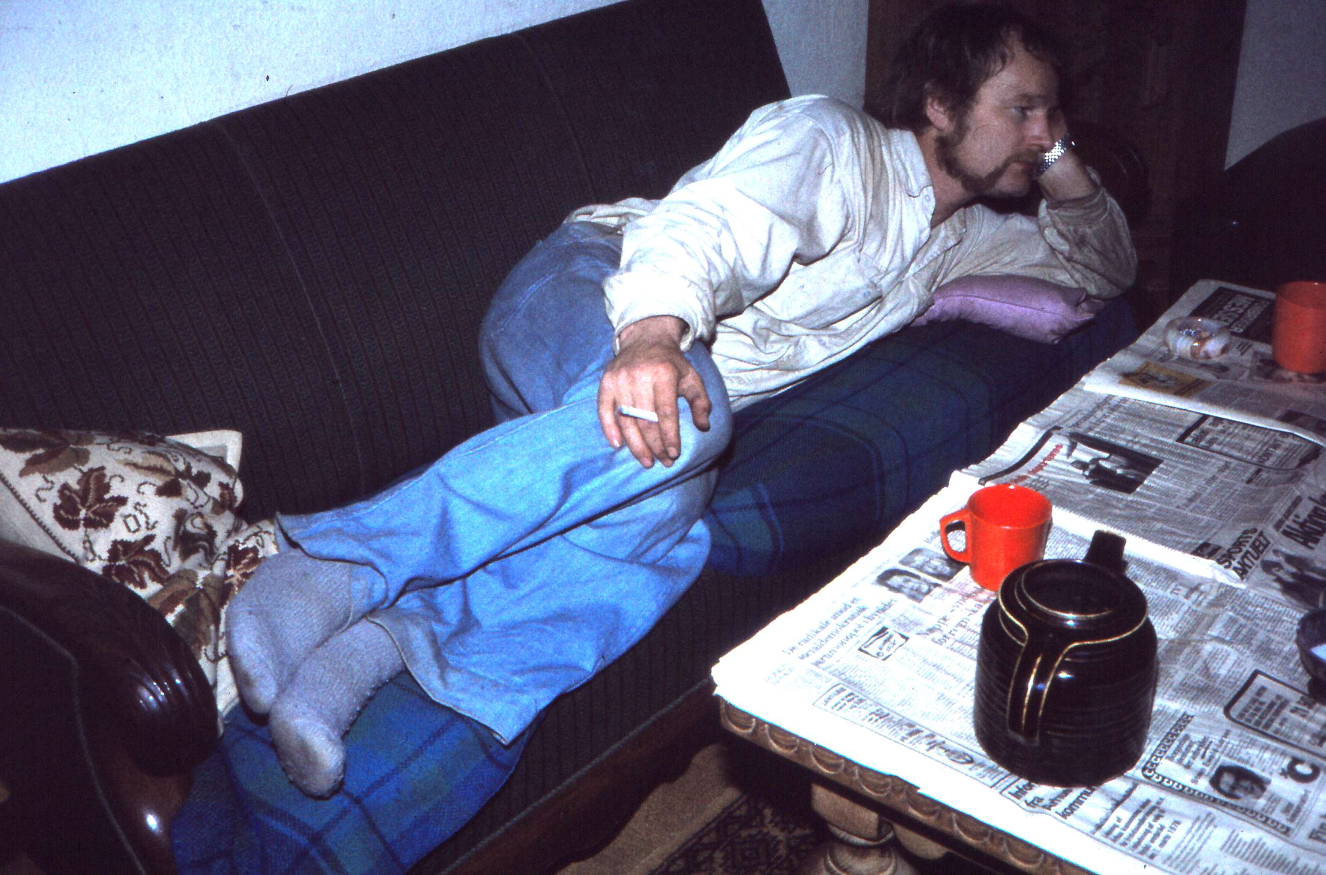 | Et hjem i Mårslet. På sofaen ligger VVS installatør Torben Christensen. Billed ID: B5587. Dias opbevares på Mårslet Egnsarkiv Registreret i Arkibas. | |||