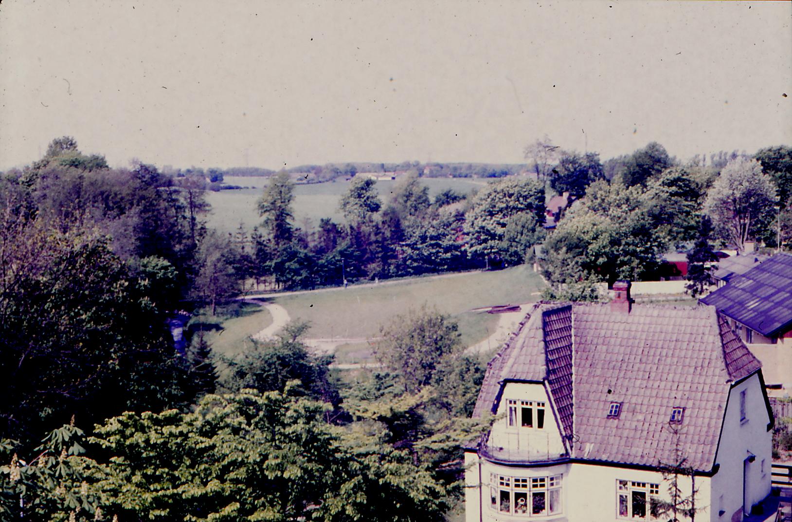 Mårslet set fra Mårslet Kirkes kirketårn. Huset i forgrunden er Obstrupvej 7.
