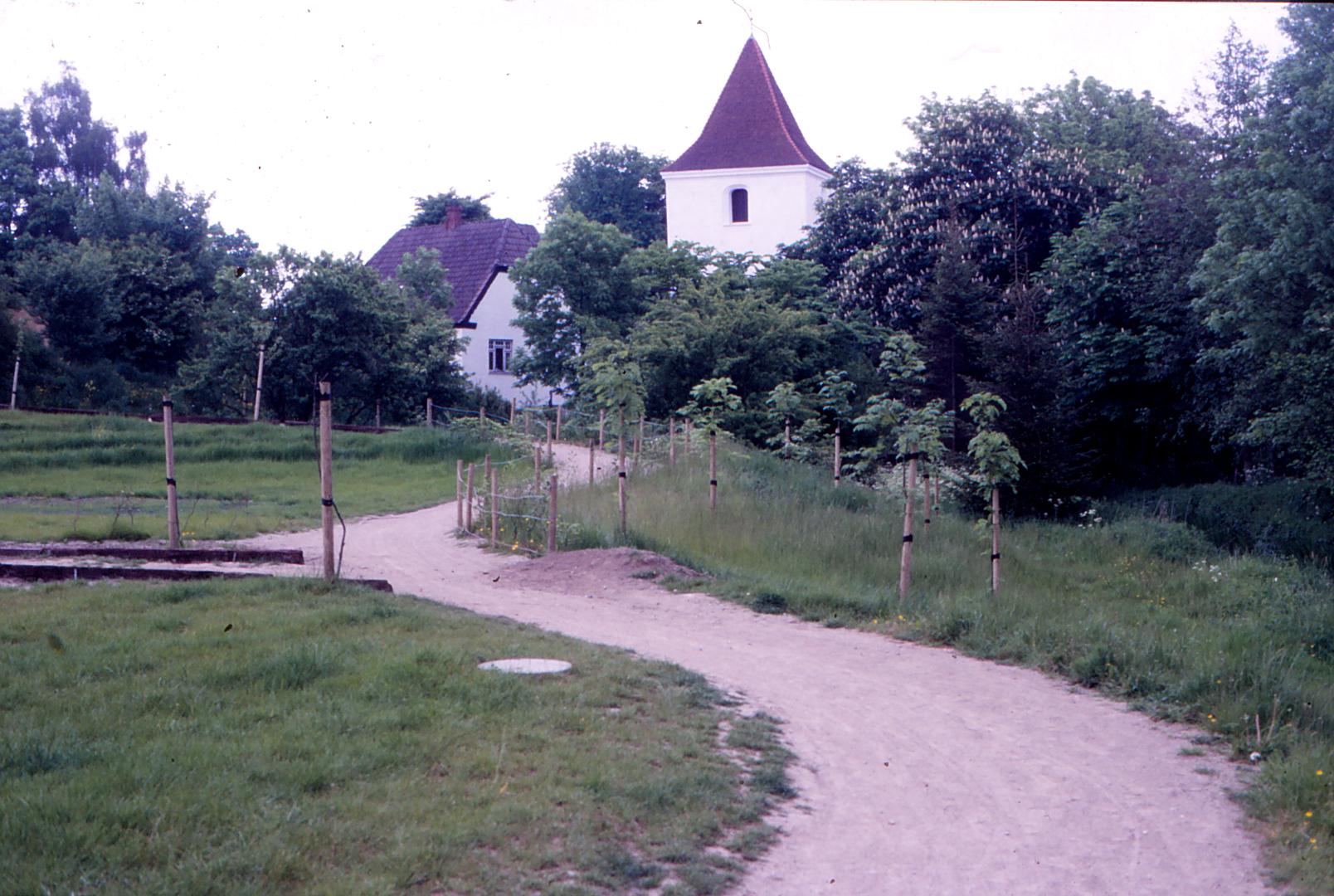 Mårslet Kirke set fra det nyanlagte stisystem langs Giberåen. Huset der ses er Obstrupvej 7.