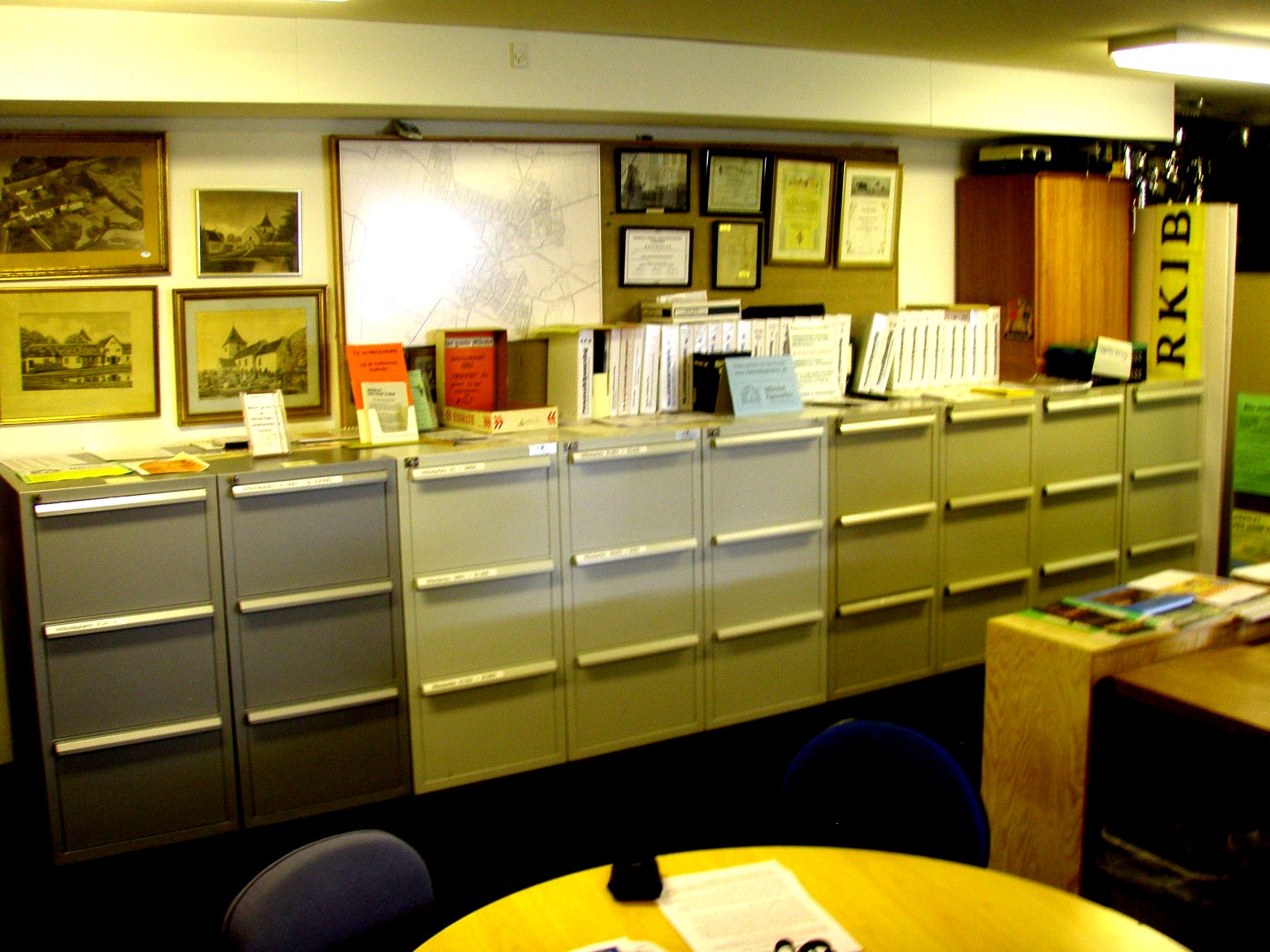 Væg mod dør. 9 'brandsikre' arkivskabe med hver 3 skuffer til hængemapper. 'Samtalebord' i forgrunden.