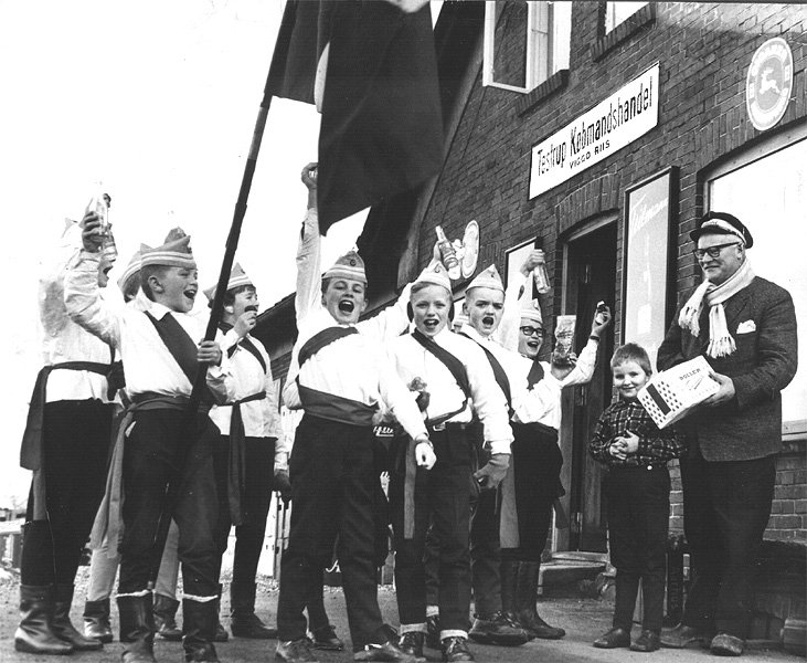 Fastelavnssoldater 1963. Ved Testrup Købmandshandel.