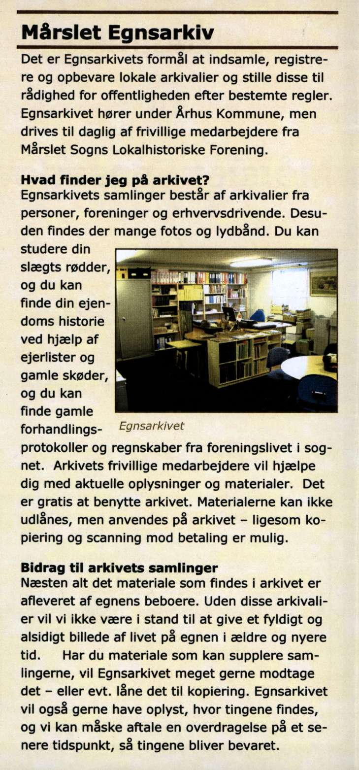 Folder udgivet af Mårslet Egnsarkiv og Mårslet Sogns Lokalhistoriske forening.