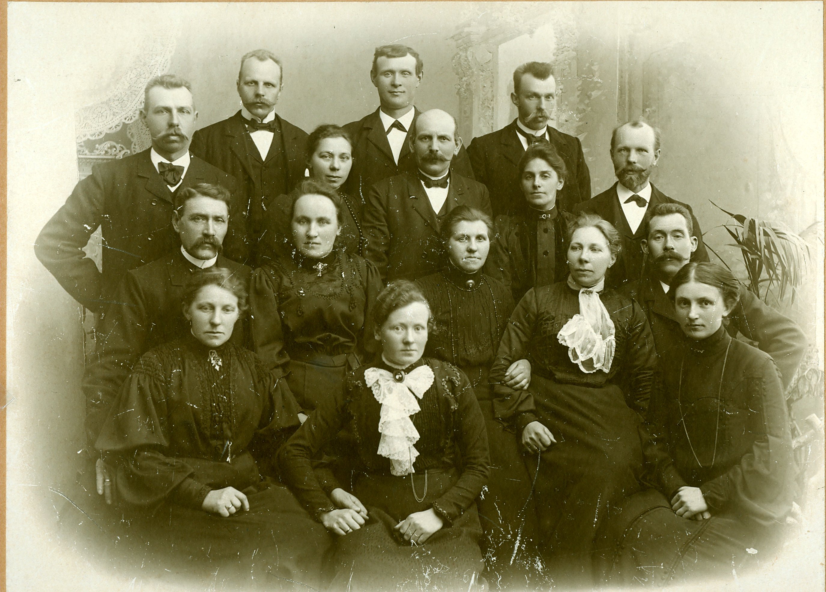| Friis familien fra Højballegaard i Hørret. 1906. Niels Friis og Karen Thomasdatters 8 børn og svigerbørn. Billedet taget i 1906 i anledning af Karen Friis 70 års fødselsdag den 6. november. Fra venstre ses (børnene med numre): 1) Jens FRIIS (Gift med Trine Jensen) Peder Sørensen 2) Thomine Andrea FRIIS (Gift med Peder Sørensen) 3) Kristen FRIIS (Gift med Karoline Sofie) Trine Jensen 4) Sofie Nicoline FRIIS (Gift med Ivan Pedersen) Ivan(Ivar?) Pedersen Inger (Inge?) Hansen Rasmus Jensen 5) Marie Kirstine FRIIS (Gift med Rasmus Jensen) 6) Hans FRIIS (Gift med Inger Hansen) Maren Rasmussen 7) Kirstine Bertha Marie FRIIS (Gift med Kristian Pilkjær) 8) Thomas FRIIS (Gift med Maren Rasmussen) Kristian Pilkjær Karoline Sofie | |
