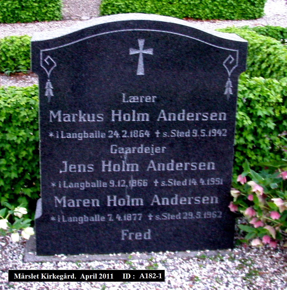 Født: 24-02-1864 Langballe Død: 09-05-1942 Langballe 78 år, 2 måneder, 15 dage Jens Holm Andersen Født: 09-12-1866 Langballe Død: 14-04-1951 Langballe 84 år, 4 måneder, 5 dage Maren Holm Andersen Født: 07-04-1877 Langballe Død: 29-05-1952 Langballe 75 år, 1 måned, 22 dage