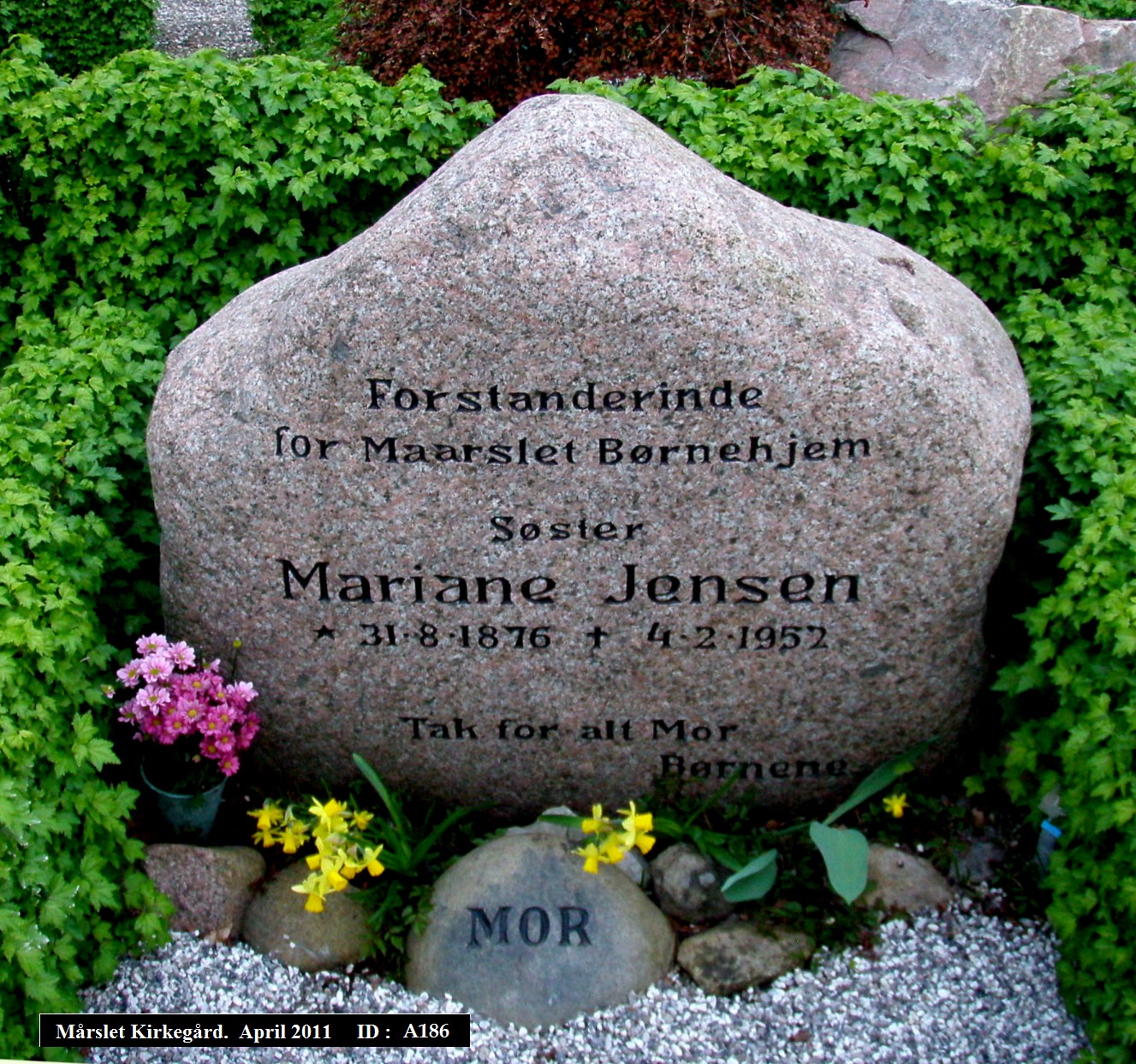 Forstanderinde for Maarslet Børnehjem Søster Mariane Jensen * 31.8.1876 + 4.2.1952 Tak for alt Mor. Børnene Gravstenen er fundet bevaringsværdig og er nu fredet. Se 'Fredede gravminder' øverst i højre hjørne. |