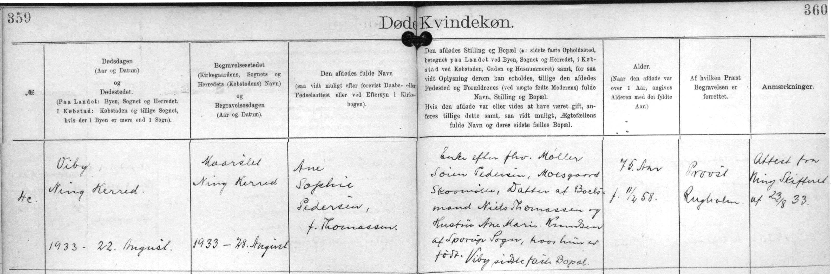 Datter af Boelsmand Niels Thomassen og Hustru Ane Marie Knudsen af Sporup Sogn, hvor hun er født. Viby sidste fælles Bopæl.