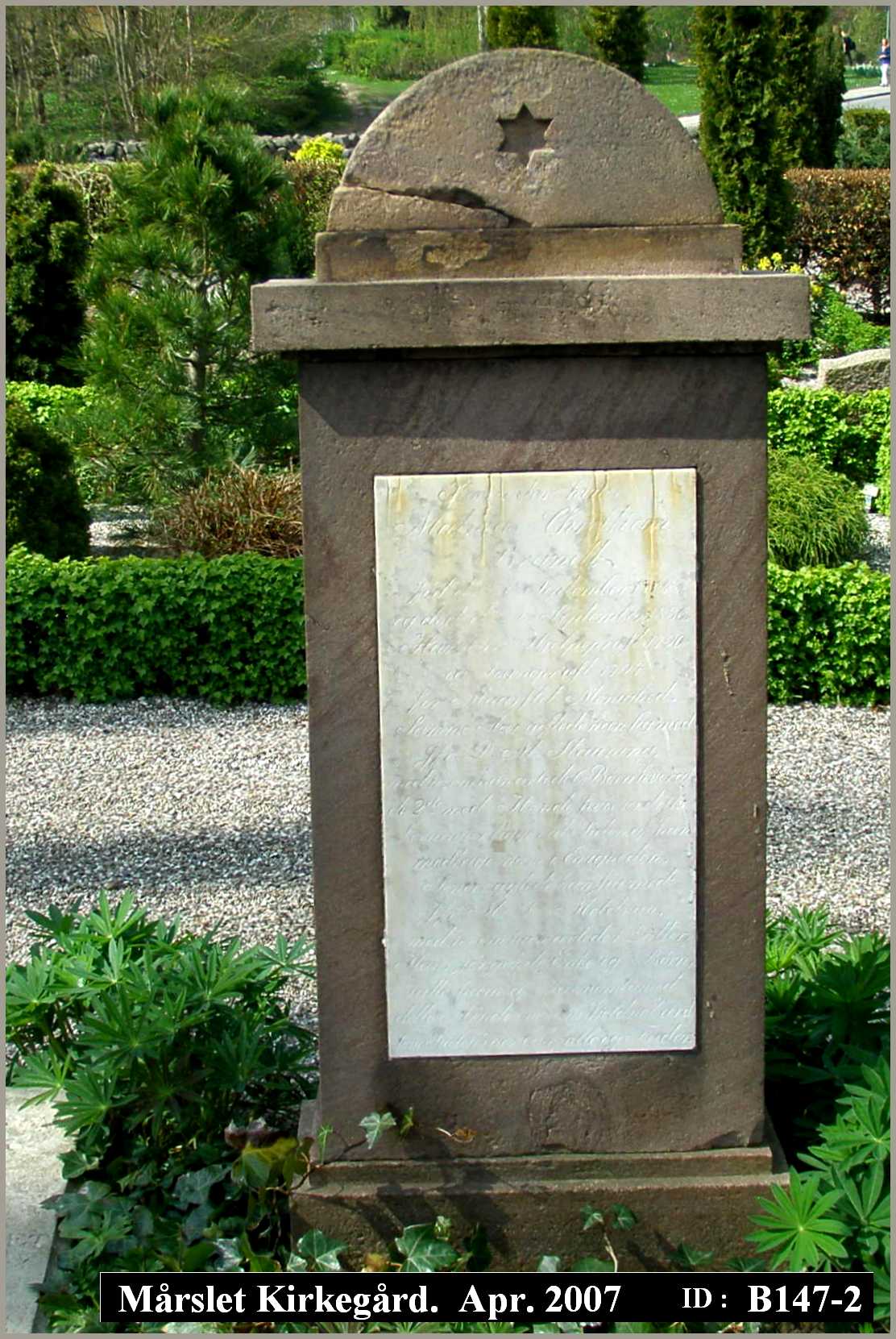 Arkibas B100299. Gravstenen er fundet bevaringsværdig og er nu fredet. Se 'Fredede gravminder' øverst i højre hjørne. Herunder hviler Mathias Christian Brandt, fød 10 September 1764 og død den 24. September 1836. Han blev hjælpepræst 1790 og sognepræst 1794 for Maarslet Menighed . Samme Aar giftede han sig med jfr. D.M.Stauning med hvem han avlede 6 Børn, hvoraf de 2de med Hende, hvis jordiske levninger ligger ved siden af hans, modtage ham i Evigheden. Senere giftede han sig med jfr. M.J.Meldrup, med hvem han avlede 1 datter. Hans sørgende Enke og Børn satte i taknemmelighed dette Minde over hans Sjældne Værd som sjælesørger, ægtefælle og Fader. |